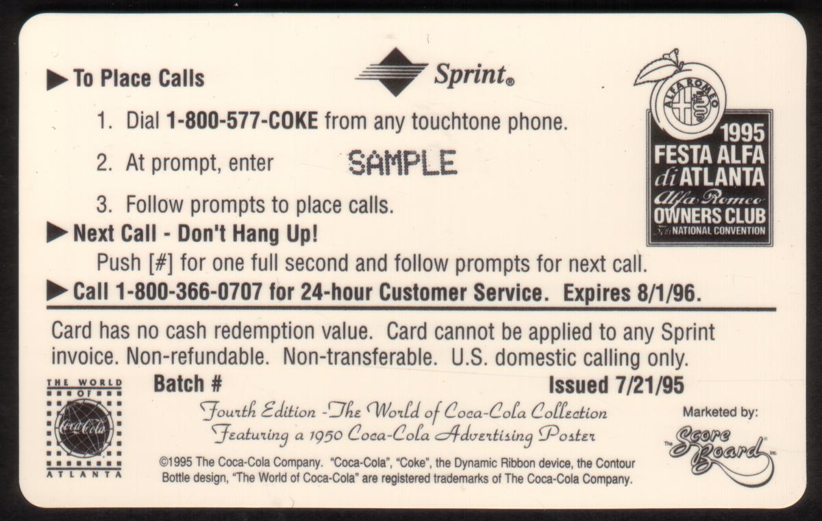 The card is specifically related to the Alfa Romeo Owner’s Club, commemorating their 37th National Convention. At the bottom, the text includes "ALFA ROMEO Owner’s Club," "37th National Convention," and "Le Carte Telefoniche," indicating that this card is a phone card with a value of "10 MINUTI." The card merges automobile culture and the iconic Coca-Cola brand, celebrating both in a nostalgic, artistic manner.