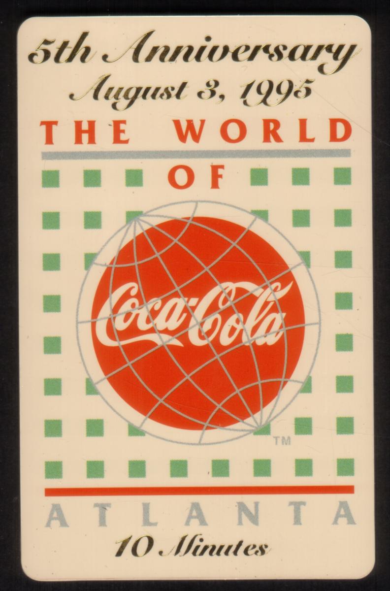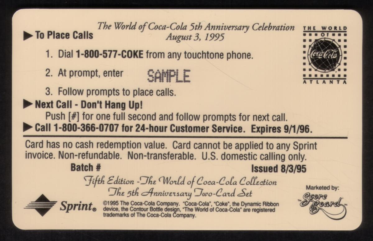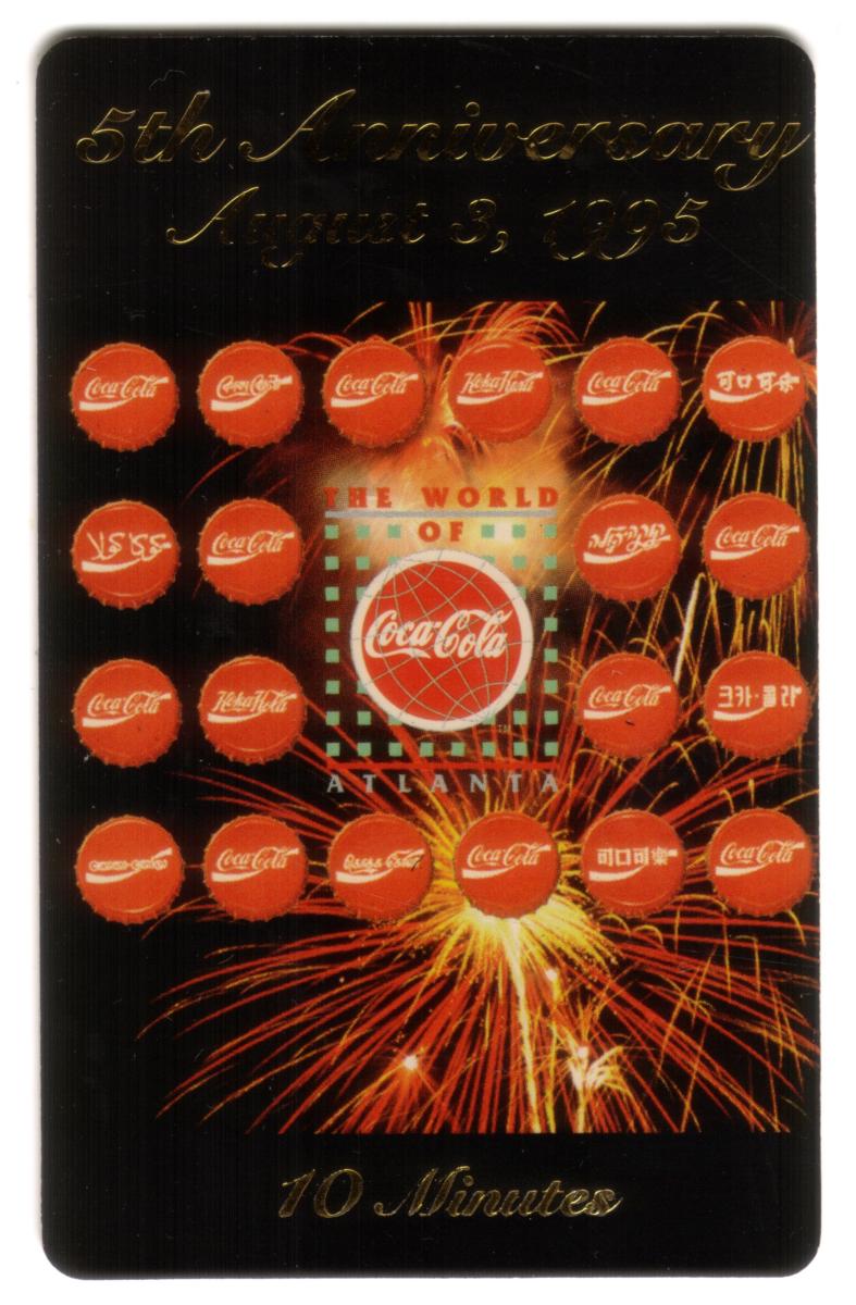 This collectible item is a set of two cards issued for the 5th Anniversary of the World of Coke. Both cards prominently feature Coca-Cola logos and Coke logos, emphasizing the iconic branding of the beverage company. The cards are marked with "10m," indicating a value often associated with collectible phone cards. The issuer is identified as The Score Board Inc., which is printed clearly on the cards.