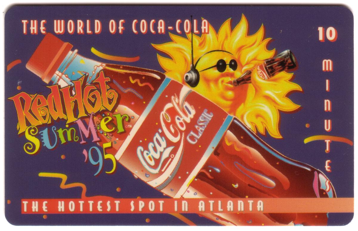 Along the top edge, the card bears the title "THE WORLD OF COCA-COLA" in orange capital letters, and along the bottom, the card states in bold white letters, "THE HOTTEST SPOT IN ATLANTA." The card is marked "10m" in small white type near the bottom right, confirming its ten-minute time denomination. The phone card is produced by The Score Board Inc., as indicated by the keywords associated with the item. The design integrates the energetic summer theme with Coca-Cola branding, capturing the spirit of Atlanta’s iconic attraction in 1995.