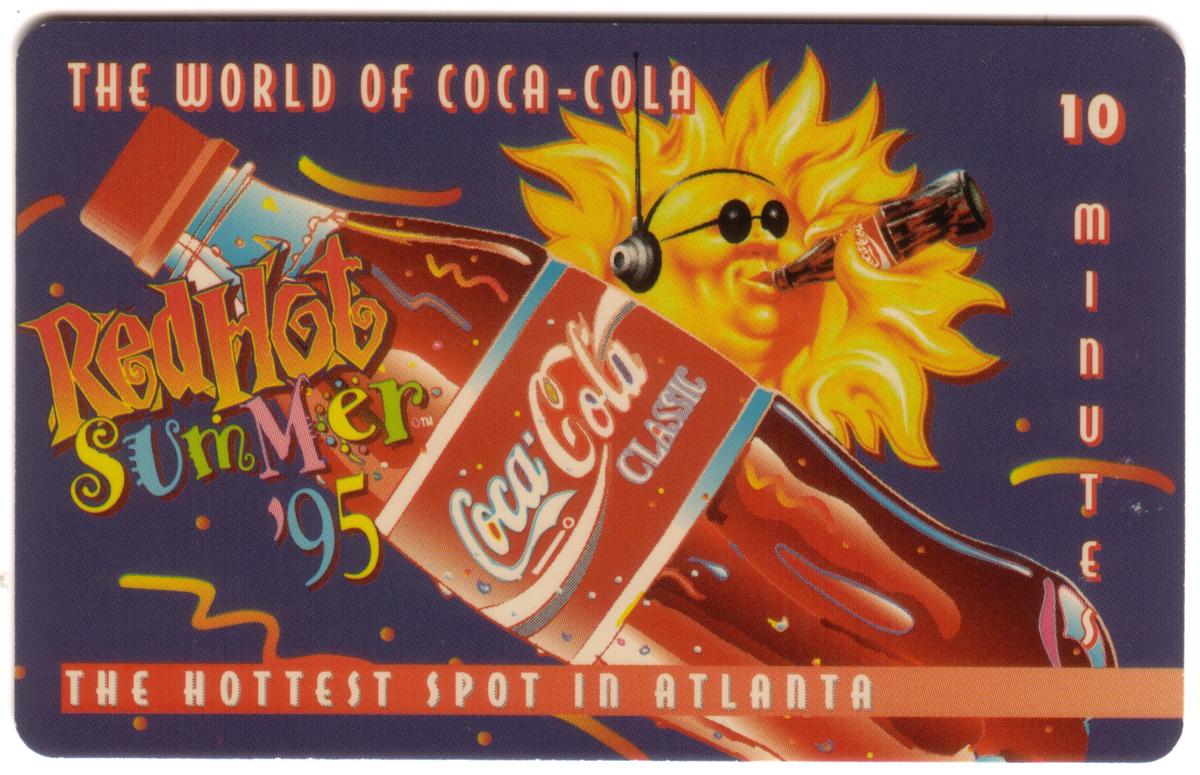 The card includes prominent text elements in various colors and styles: "Red Hot Summer '95" is written in a playful font with red, yellow, and green hues along the left side of the bottle. At the top left, the phrase "THE WORLD OF COCA-COLA" is displayed in uppercase serif letters. Along the bottom edge, the slogan "THE HOTTEST SPOT IN ATLANTA" is clearly presented in white uppercase letters against a red-orange banner background.