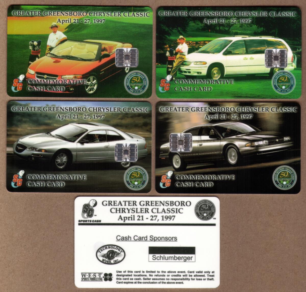 Each card includes the text "GREATER GREENSBORO CHRYSLER CLASSIC April 21 - 27, 1997" at the top and "COMMEMORATIVE CASH CARD" printed on the bottom left next to the "SC" golf logo. Embedded chips appear on the right side of each card, reflecting their function as stored value smart cards. These cards highlight the connection between Chrysler vehicles and the golf tournament sponsored by West Sports Marketing.