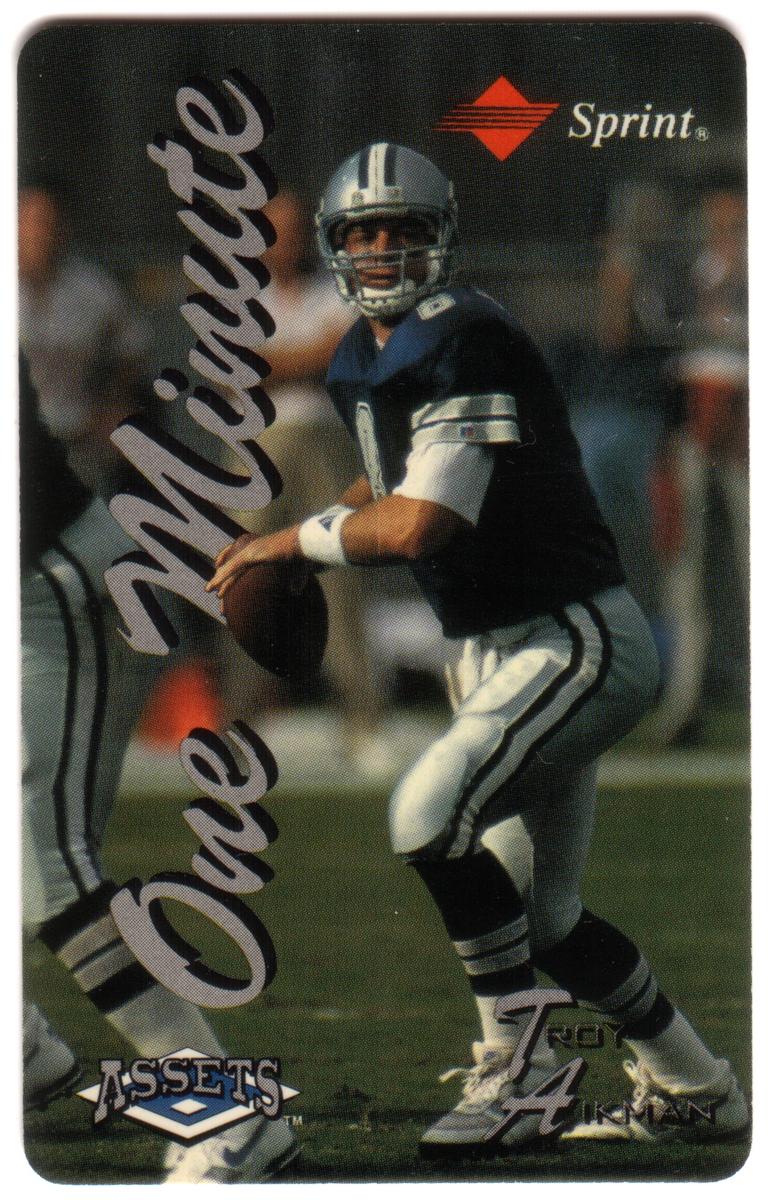 This collectible card features Troy Aikman, a former professional football player in the National Football League (NFL). The card is from the "1 Minute Assets Series #1" issued in 1994. Troy Aikman is depicted wearing a helmet and shoulder pads, dressed in a Dallas Cowboys uniform. The card includes a photographic image of Aikman in action, positioned prominently on the left side of the card.