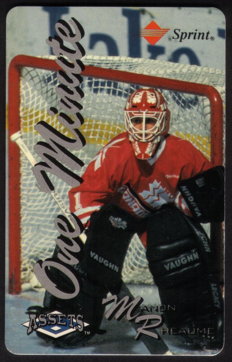 The card includes various printed text elements: "One Minute" in large stylized script running vertically along the left side, and "Manon Rheaume" printed near the bottom right corner with the initials "M" and "R" emphasized. The "ASSETS" logo appears at the bottom left of the card. The Sprint logo is displayed in the top right corner in black and orange. This is a specimen card from the 1 Min Assets Series #1 issued in 1994, related to NHL hockey players.