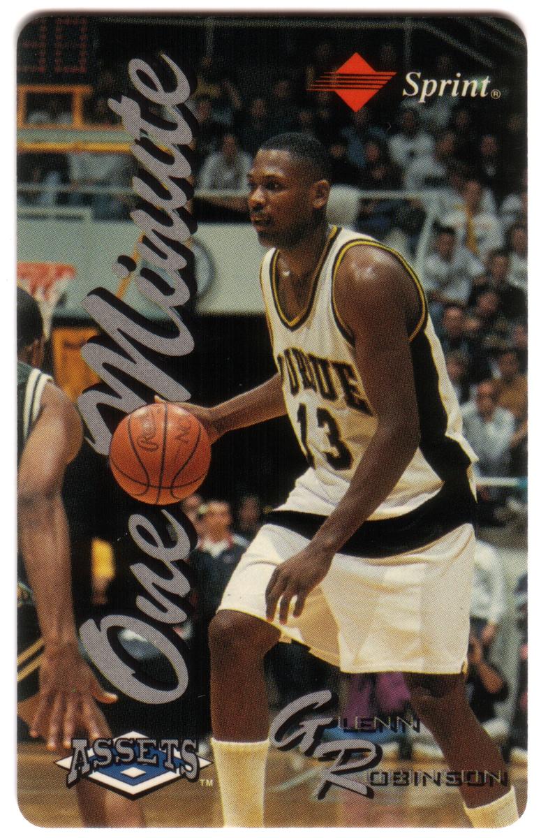 This collectible card is related to basketball and features Glenn Robinson, a professional NBA player. The card belongs to the 1 Minute Assets Series #1 issued in 1994 and includes the date 12/01/95 printed on it. It is marked with the word "SPECIMEN" and branded by The Score Board Inc. The card also contains imagery associated with the NBA, including a basketball, a basketball hoop, and the NBA logo.