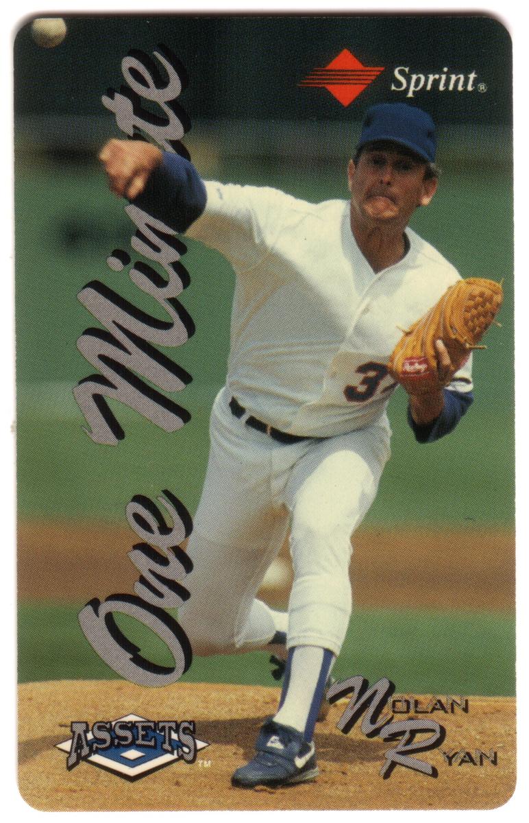 This collectible card features Nolan Ryan, a legendary Major League Baseball pitcher, depicted in the 1 Minute Assets Series #1 from 1994. The card clearly identifies Nolan Ryan along with the date "12/01/95" printed on it. The image shows Nolan Ryan in his baseball uniform, emphasizing his prominence in MLB history. The card bears the logo of The Score Board Inc., a known producer of sports collectible cards.