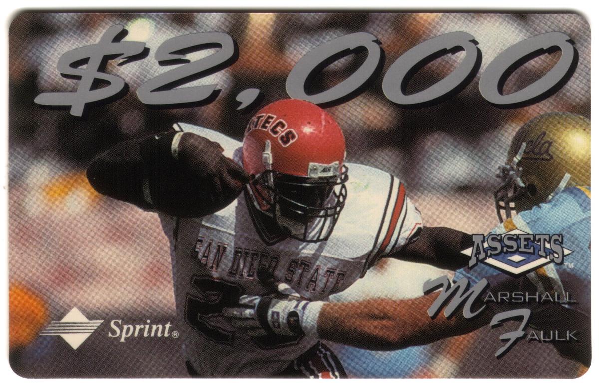 The card displays "$2,000" in large silver numbers at the top left corner. Below the player image, the Sprint logo appears on the lower left side. On the lower right side, the card shows the text "ASSETS" with a stylized design beneath it, along with the signature-style text "Marshall Faulk." The card is from The Score Board Inc. and is dated 03/31/96. The theme centers around NFL and football sports collectibles, highlighting Marshall Faulk during his collegiate career with the Aztecs.