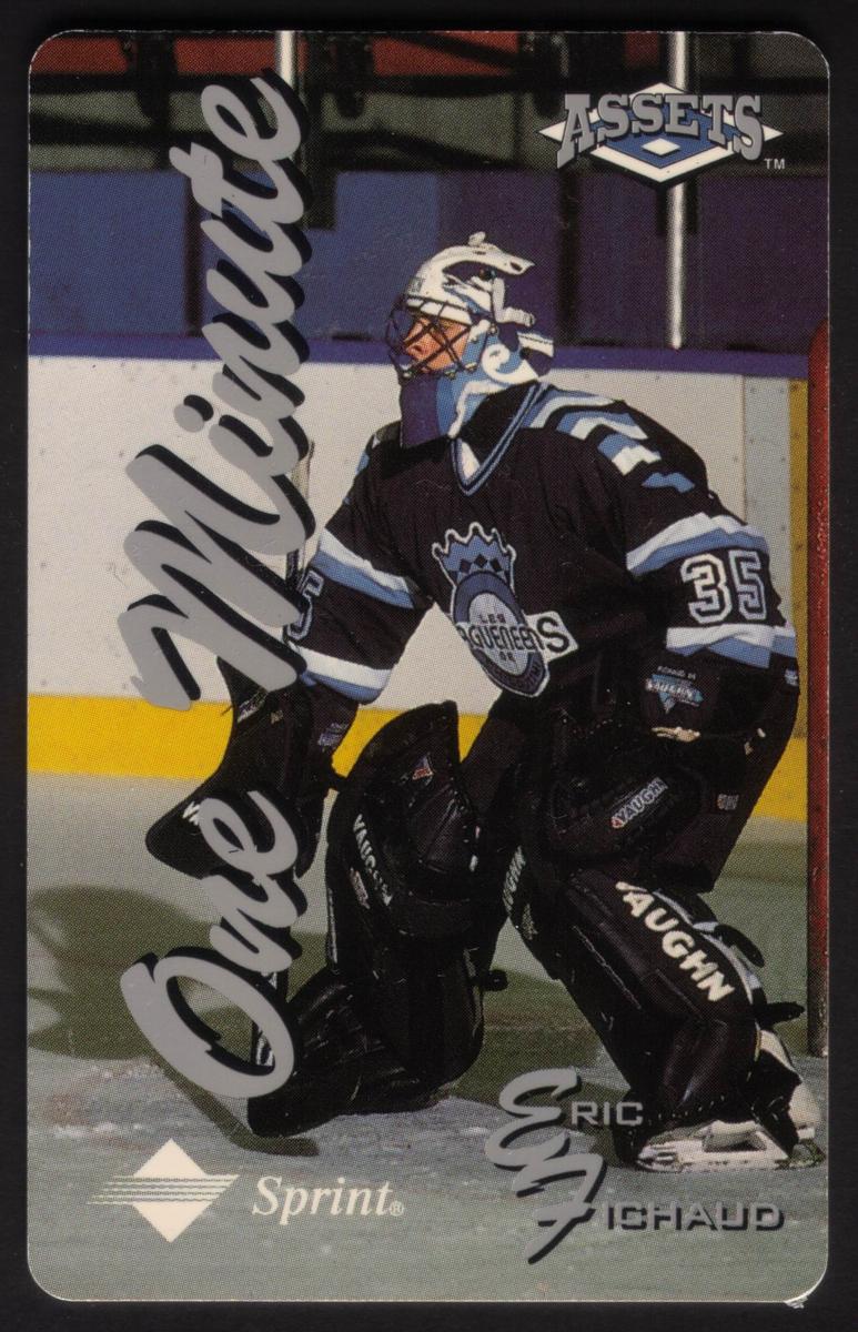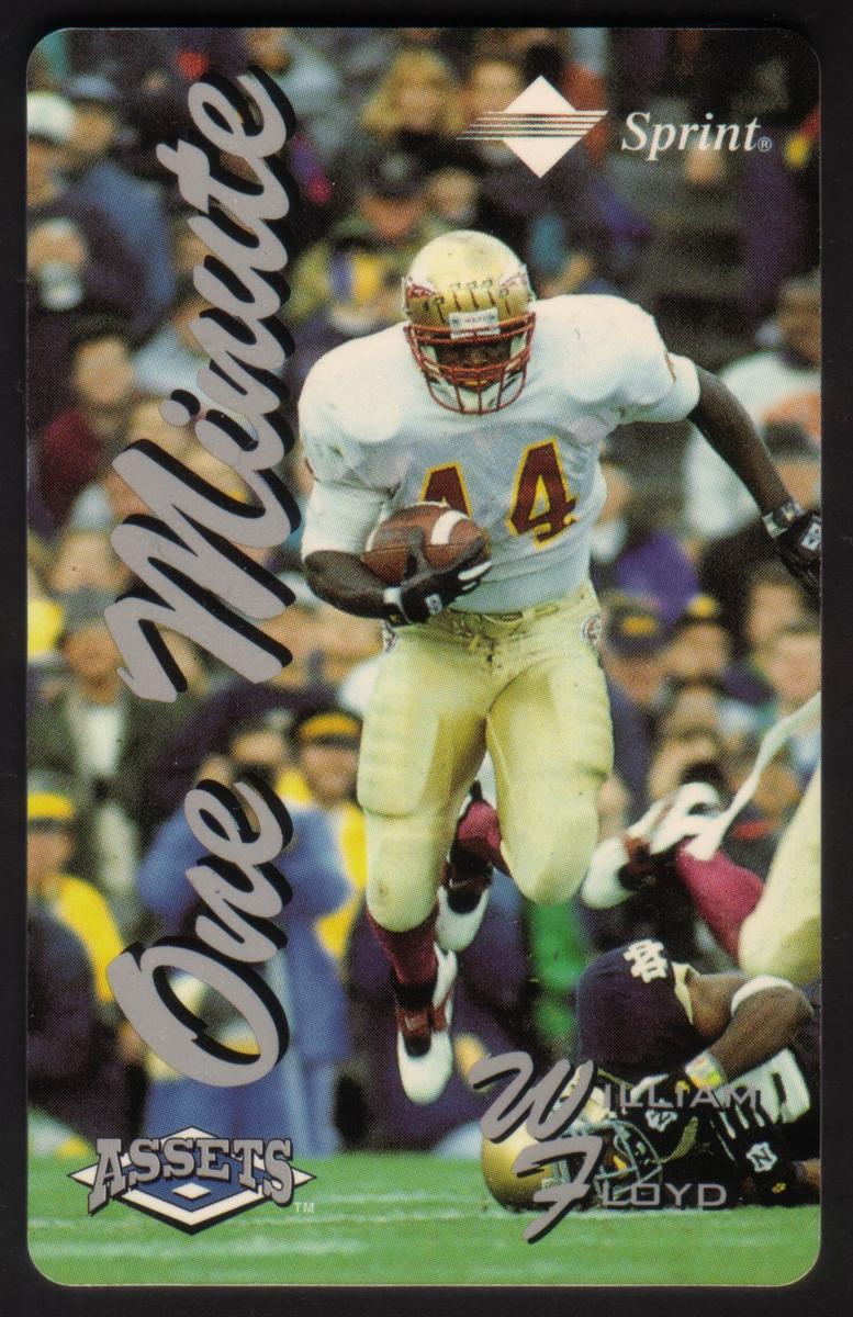 The action photography and design emphasize the athletes' intensity and focus, making these cards a vivid collectible set from the mid-1990s sports scene. The cards capture dynamic moments across football, baseball, hockey, basketball, and auto racing under the cohesive branding of "One Minute" and "Assets" with Sprint as the sponsor.