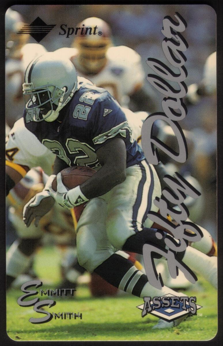 This collectible phone card features Emmitt Smith, a prominent football player for the Dallas Cowboys. Smith is shown in action on the football field, gripping the ball in both hands and running forward while wearing the Cowboys’ traditional silver helmet and blue jersey numbered 22. The uniform includes white pants with a blue stripe, and Smith is wearing white gloves and black and white cleats. The scene captures a moment of play, with an opposing player in a white and yellow uniform partially visible behind him.