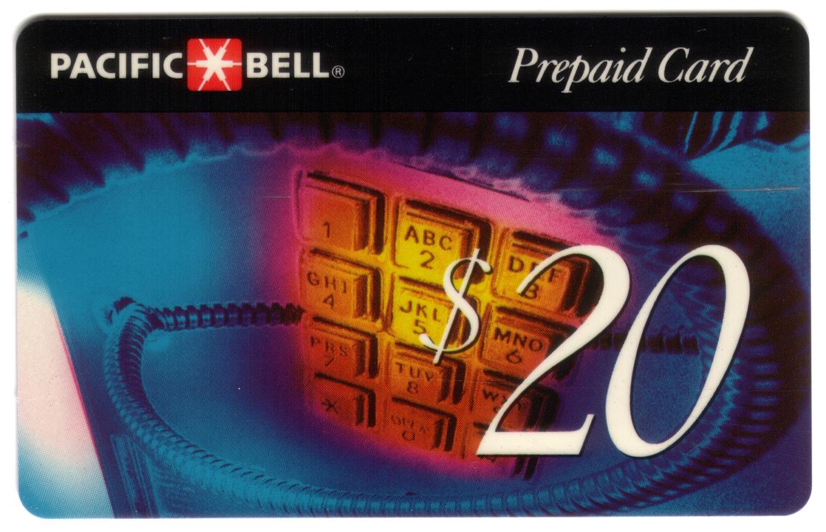 The $20 Pacific Bell logo appears prominently on the card, signifying its association with Pacific Bell, a historic telecommunications company. The card combines technological imagery with a clean, polished aesthetic, reflecting the functionality of telephone equipment in everyday use.