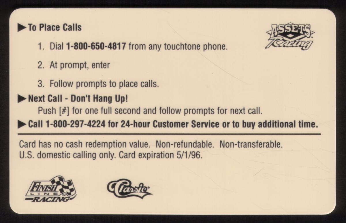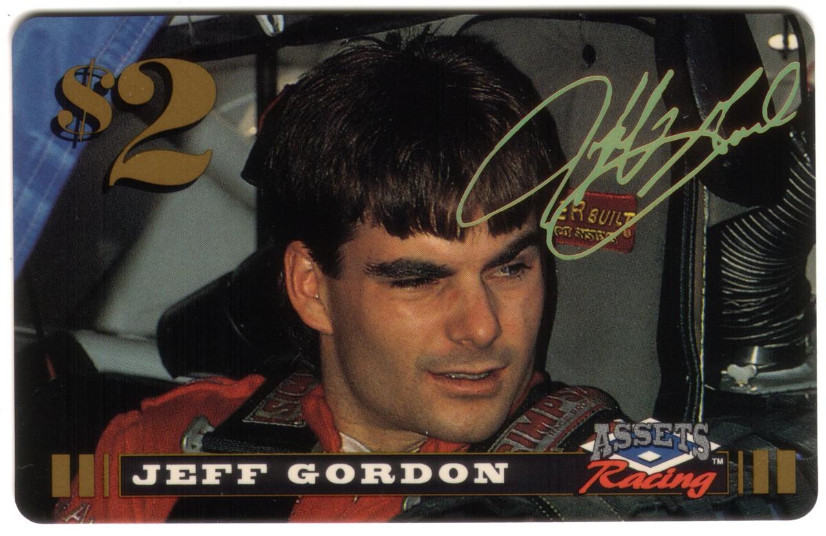 This phone card is from the Assets Racing 1995 series. It celebrates Jeff Gordon, a well-known NASCAR driver, making it a valuable item for collectors interested in auto racing and Jeff Gordon memorabilia.
