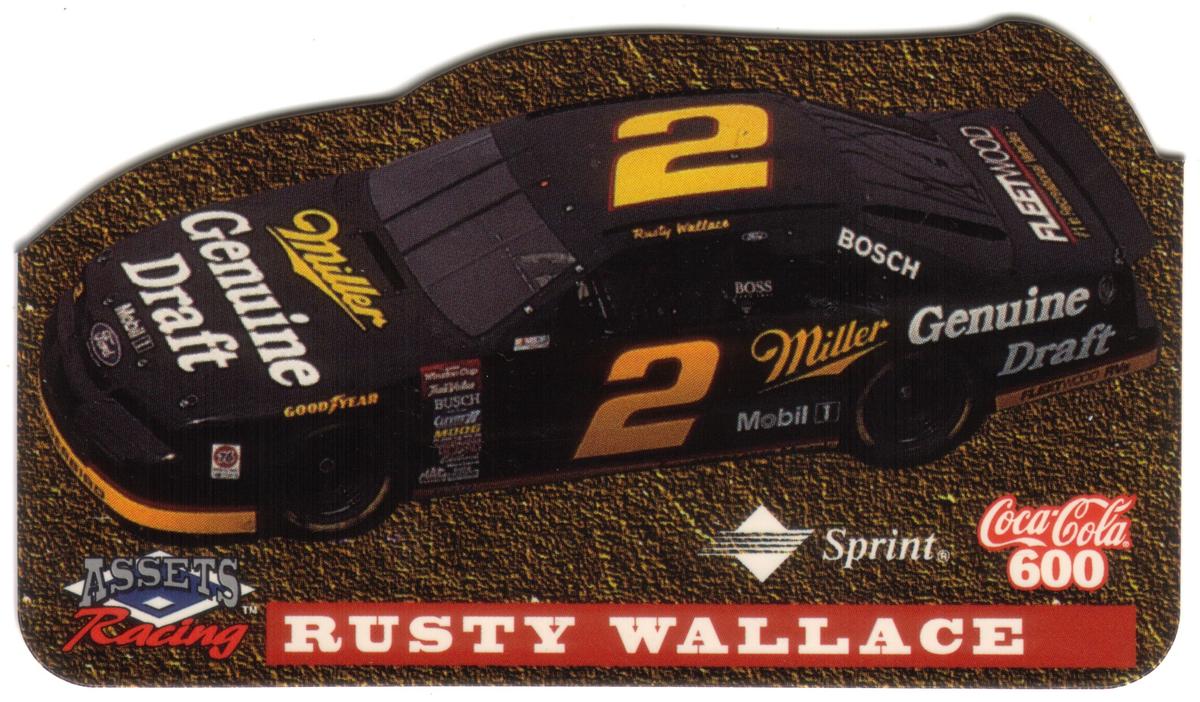 These collectible die-cut cards from the Finish Line Racing Coca-Cola 600 set feature prominent NASCAR drivers and their race cars. Each card showcases a detailed photographic image of a specific race car prominently displaying its main sponsor, car number, and various technological and automotive decals. The cards include the "Coca-Cola 600" logo and the Assets Racing logo along with the Sprint logo on all except the Dale Earnhardt card, which does not have the Sprint logo visible.