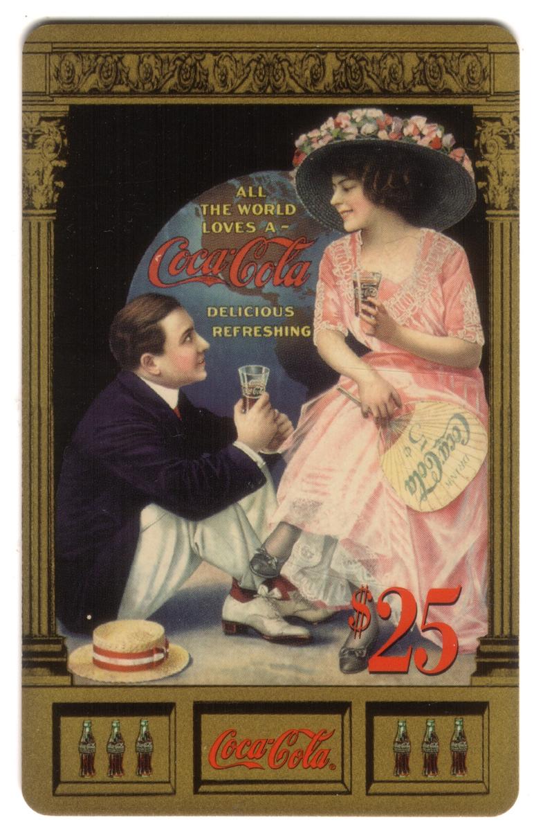 This collectible card features two figures, a lady and a man, prominently holding Coca-Cola bottles. The man wears a white sleeveless shirt and a white cap turned backward, while the woman is dressed in a sleeveless green top and has long dark hair. Both individuals are smiling and positioned close together against a warm, golden-toned background.