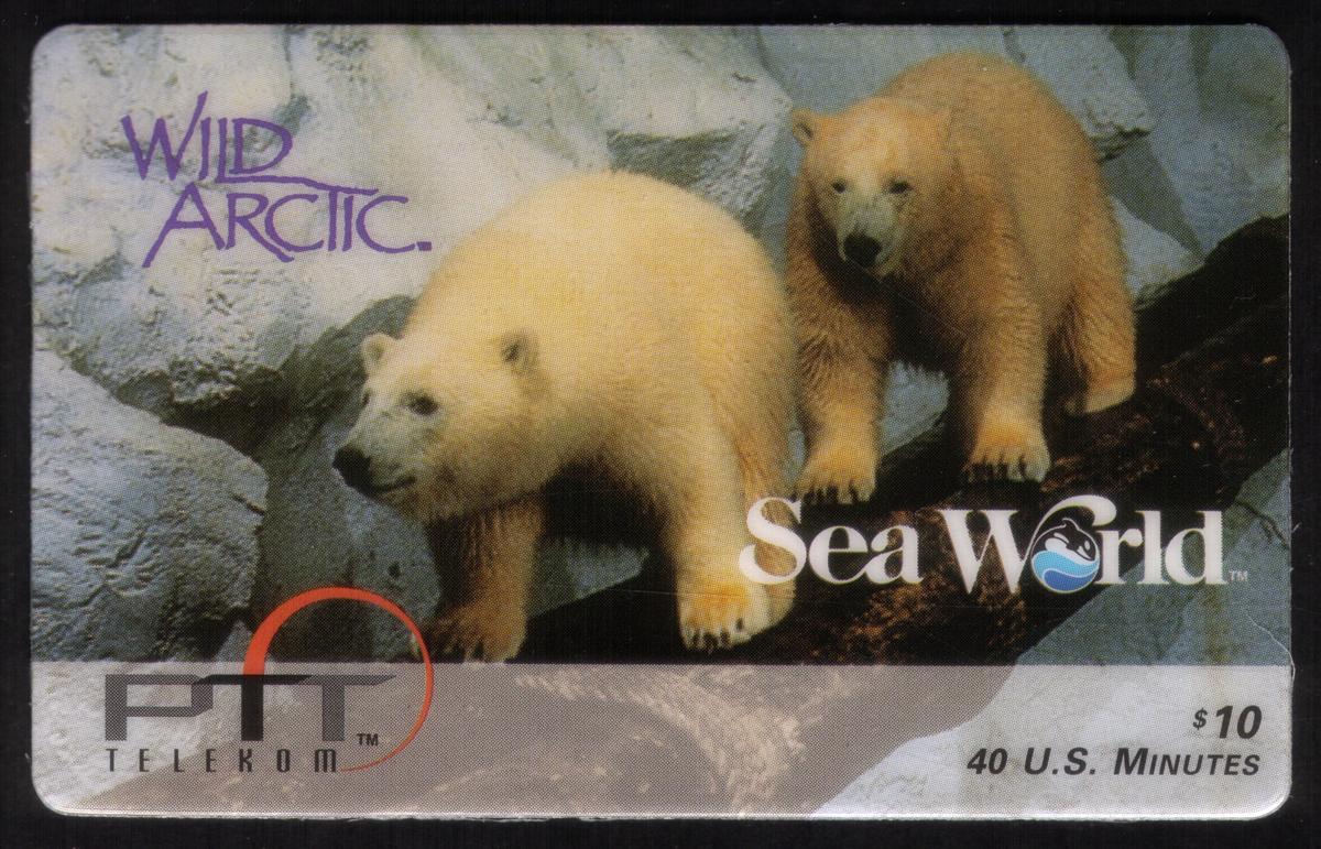 SeaWorld Wild Arctic phone card with $10 calling credit, featuring polar bears on driftwood, icy Arctic background, and iconic SeaWorld logo. |