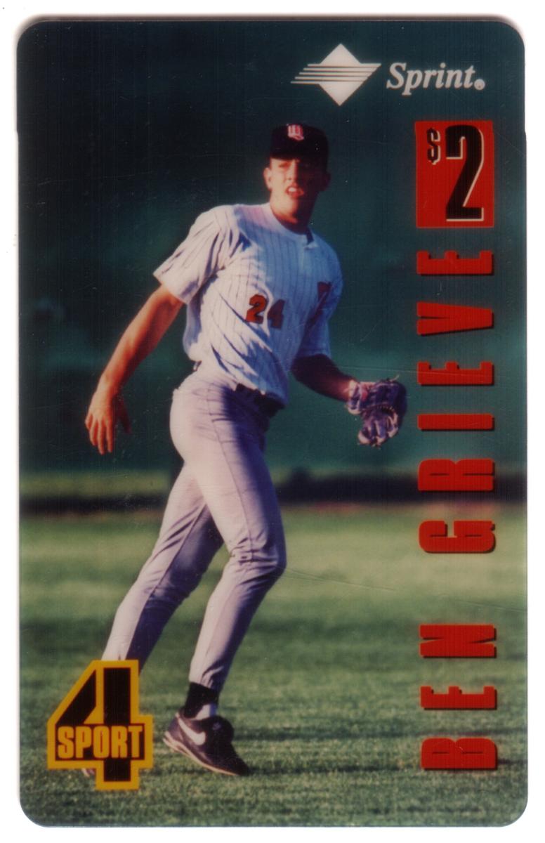 This phone card is linked to baseball and Major League Baseball themes, emphasizing Ben Grieve as a featured athlete. The card has a mint condition photographic image and clear branding elements that highlight its collectible value within sports and baseball memorabilia.