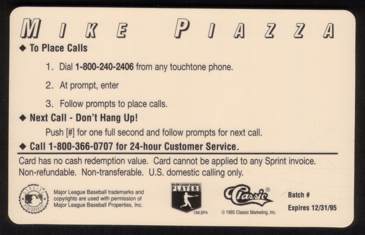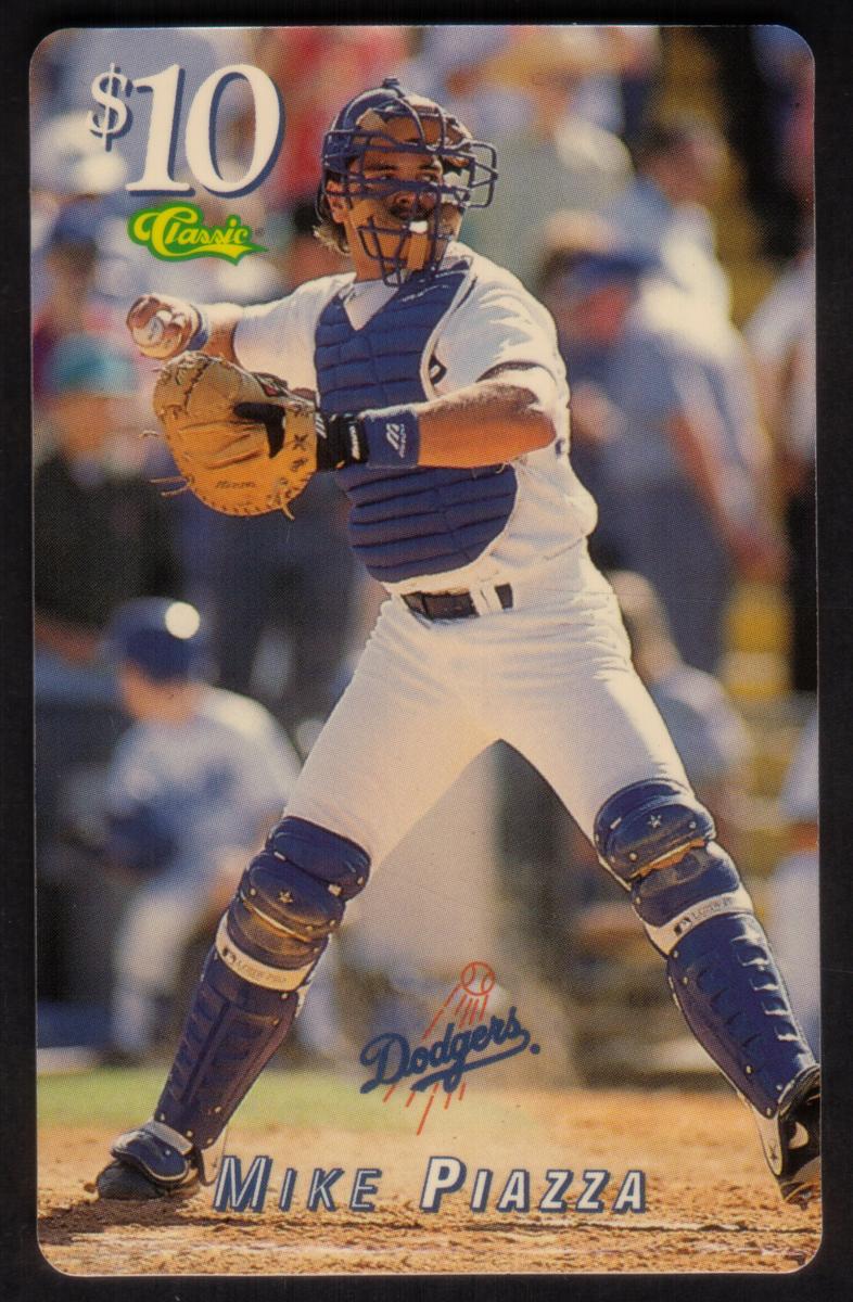 This card highlights Mike Piazza as a key player for the Los Angeles Dodgers and is part of a set featuring MLB baseball players, bats, and balls. It emphasizes the sport of baseball with a clear focus on player action and team identity.