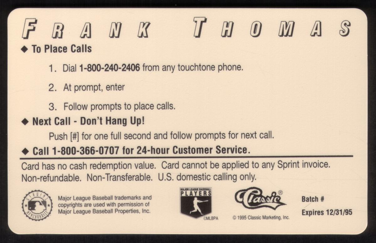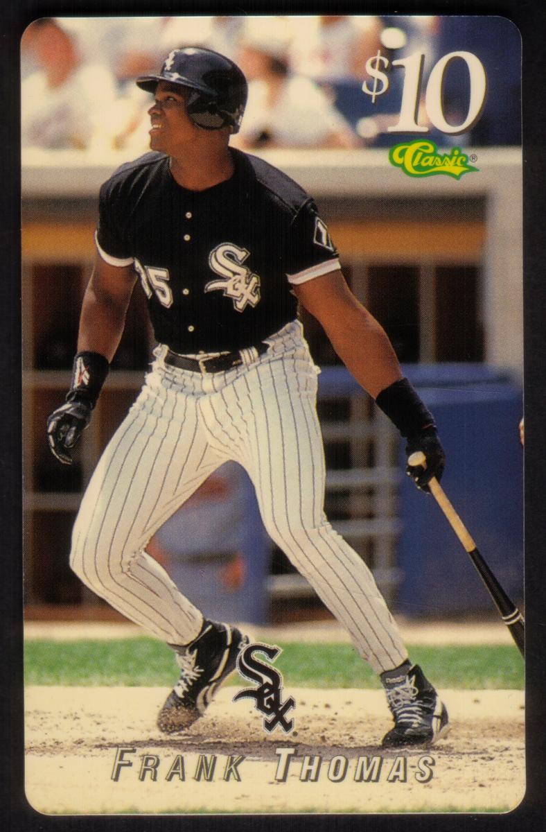 This collectible card features Frank Thomas, a Major League Baseball player for the Chicago White Sox, captured in action during a game. Frank Thomas is wearing the Chicago White Sox uniform which consists of a black jersey with the iconic white "Sox" logo prominently displayed on the left chest and white pinstriped pants. The jersey also includes the number 35 on the front right side. He is holding a baseball bat in a batting stance, appearing poised and focused.