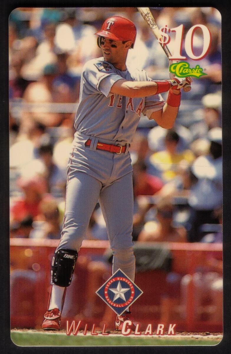 The background incorporates the classic colors and iconography associated with Major League Baseball and the Texas Rangers, including the team’s logo, which is clearly visible. The card’s text explicitly identifies Will Clark and associates him with the Texas Rangers franchise. The overall presentation aligns with collectible sports memorabilia from the 1990s, focusing on baseball player representation and official league branding.