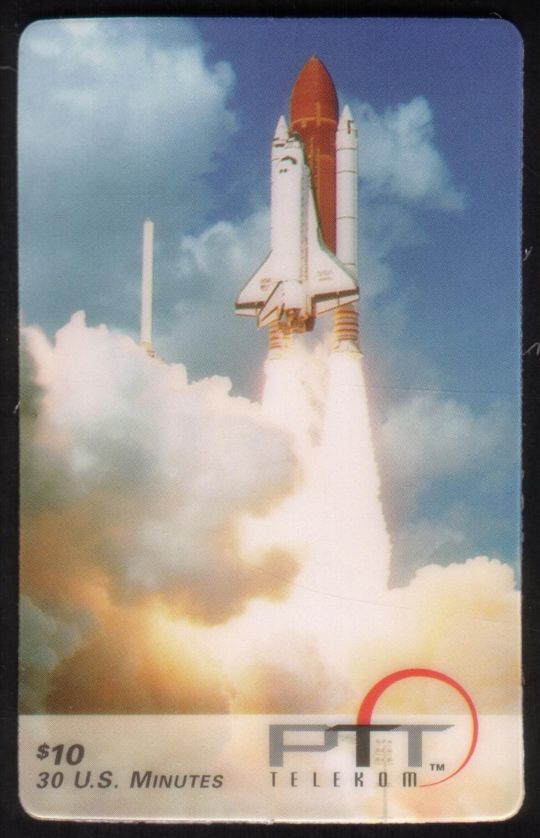 Space shuttle launch scene with $10 and 30 U.S. Minutes, featuring NASA imagery, PTT TELEKOM branding, and a sleek, collectible design. |