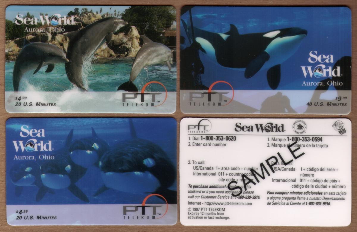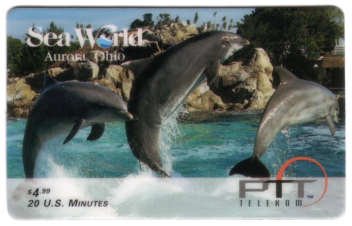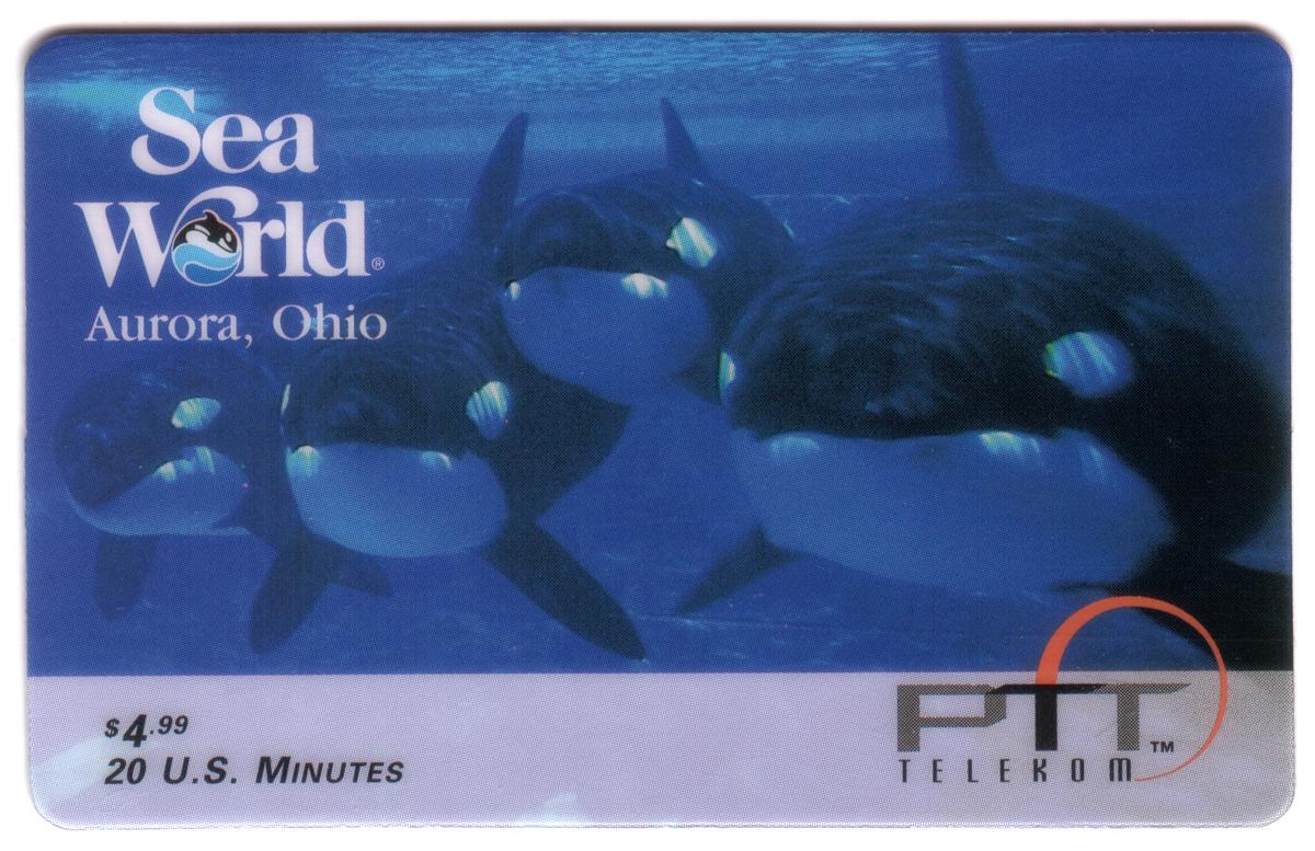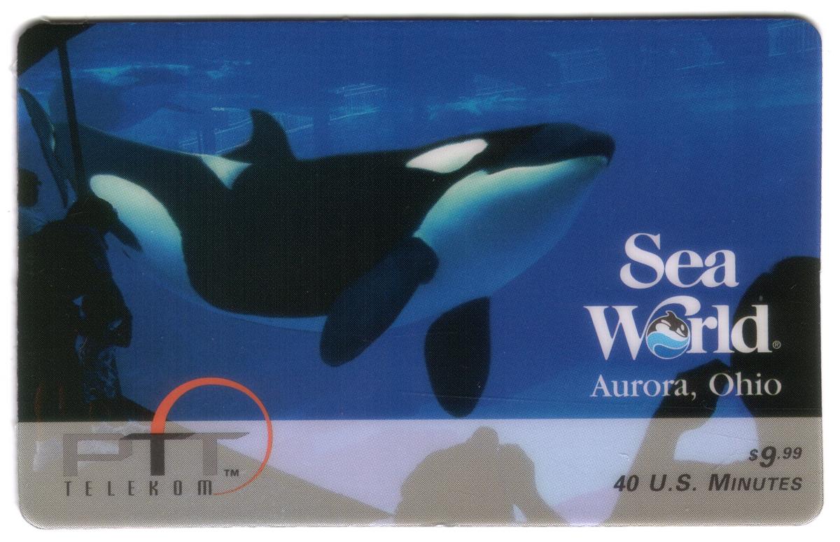 This collectible phone card features marine animals prominently associated with SeaWorld, an Orlando, Florida theme park and attraction. The card displays images of killer whales, also known as orcas, alongside dolphins, representing well-known marine mammals from Florida’s aquatic wildlife exhibits. The design emphasizes the natural environment of these animals, showcasing their sleek forms and dynamic movements.
