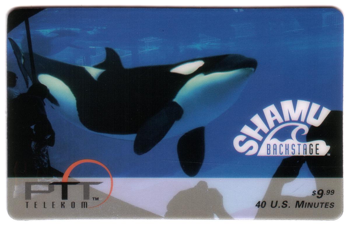 In the upper right corner, the logo for PTT Telekom is present, linking the card to the telecommunications company that issued it. The phone card highlights marine animals and wildlife, tying in the signature Florida attractions and zoo elements common to Sea World. The overall design successfully captures the essence of marine life through the vivid image of Shamu, making it a collectible item associated with Florida’s aquatic wildlife and theme parks.