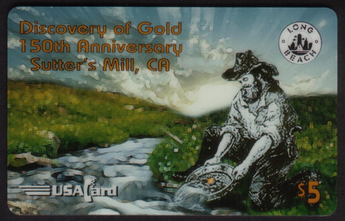 Long Beach Coin Expo 1998 phone card honoring California Gold Rush and Sutter''s Mill 150th anniversary, featuring gold panner, historic design, and $5 value. |