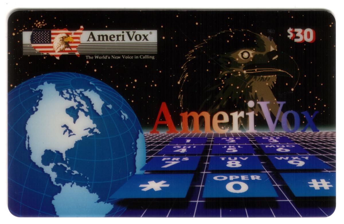 Valued at 30, this AmeriVox card features space-themed artwork, a globe, eagle motif, futuristic dialing pad, and patriotic symbols highlighting global communication. |