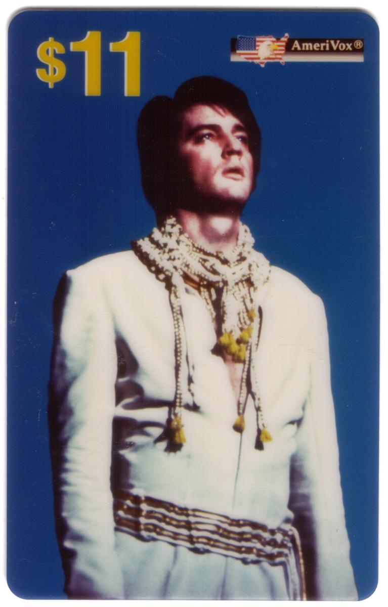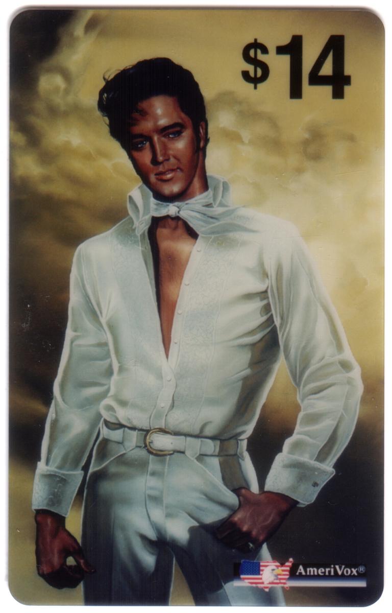 Each card prominently displays a monetary value ranging from $2 to $14, and every design incorporates the AmeriVox logo alongside an American flag motif. The cards honor Elvis Presley as a celebrated American icon recognized for his singing, musicianship, and acting. The overall collection artistically portrays his legacy and contributions to entertainment.