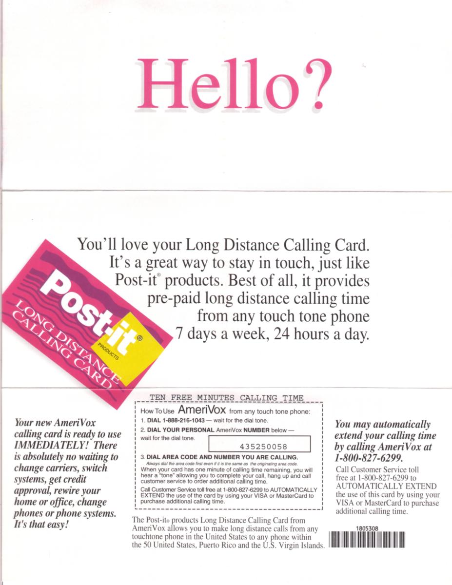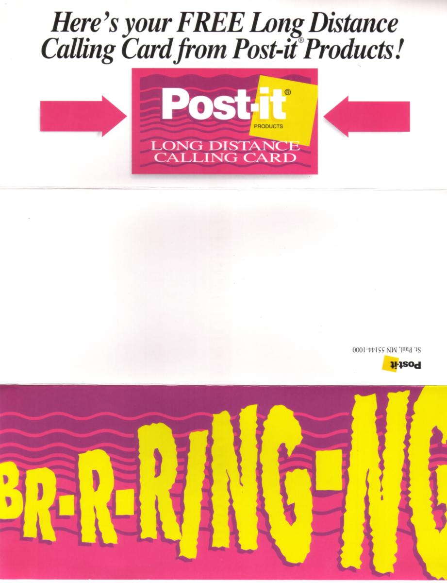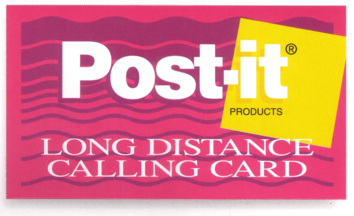 This card serves as a promotional item connected to Post-it® products, incorporating their recognizable logo and branding colors. It is a collectible item reflecting advertising for Post-it® in the context of long distance calling services. The overall design is simple yet eye-catching, combining bright colors with clear typography to emphasize the Post-it® brand and the function of the card.