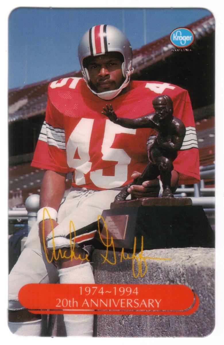 The card commemorates the 20th anniversary of Archie Griffin's recognition, with text at the bottom reading "1974-1994 20th ANNIVERSARY" in white lettering on a red banner. Archie Griffin's autograph appears in gold script near the bottom left. The Kroger logo is placed at the top right corner of the card, associating the collectible with the grocery store chain.