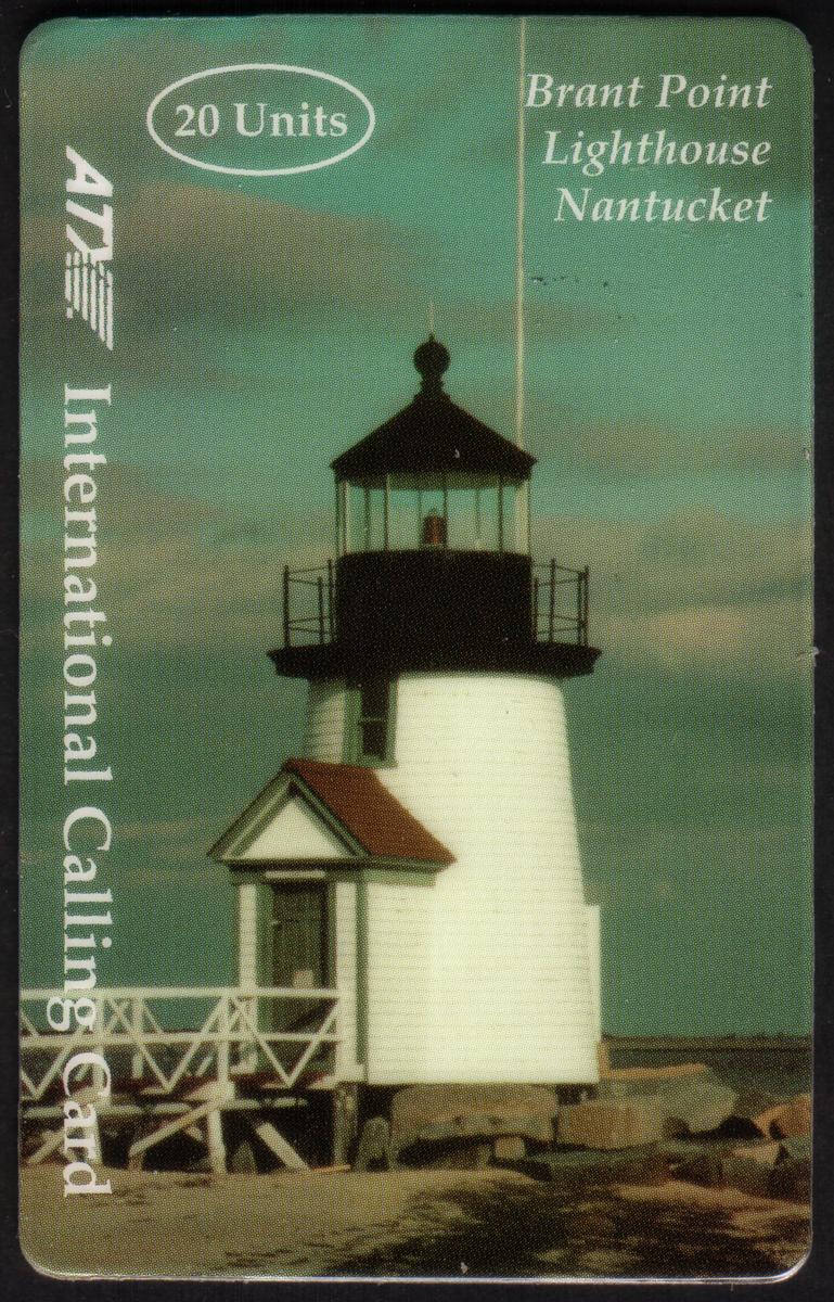 The second card, also a 20 Unit card, depicts the Brant Point Lighthouse on Nantucket. This lighthouse has a distinct shape, with a shorter white tower topped by a black lantern room. The lighthouse also features a small white building with a red roof, connected to the land by a wooden walkway extending over the rocky shoreline. The background shows low clouds under a subdued sky. The card’s left side bears the AT&T branding, and the upper right corner labels it clearly: "Brant Point Lighthouse Nantucket."
