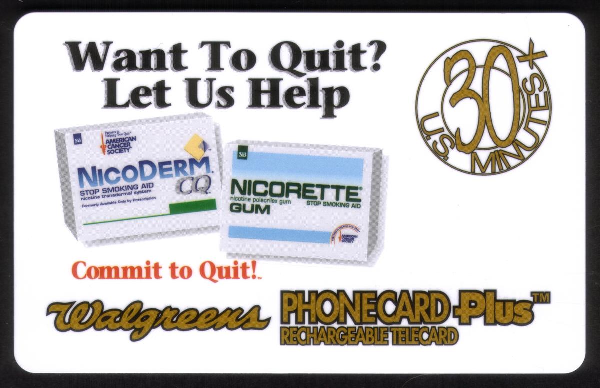 This phone card clearly promotes medical and health-related products aimed at helping users quit smoking while providing prepaid telephone service, featuring a professional and clean design centered around Walgreens and smoking cessation products.