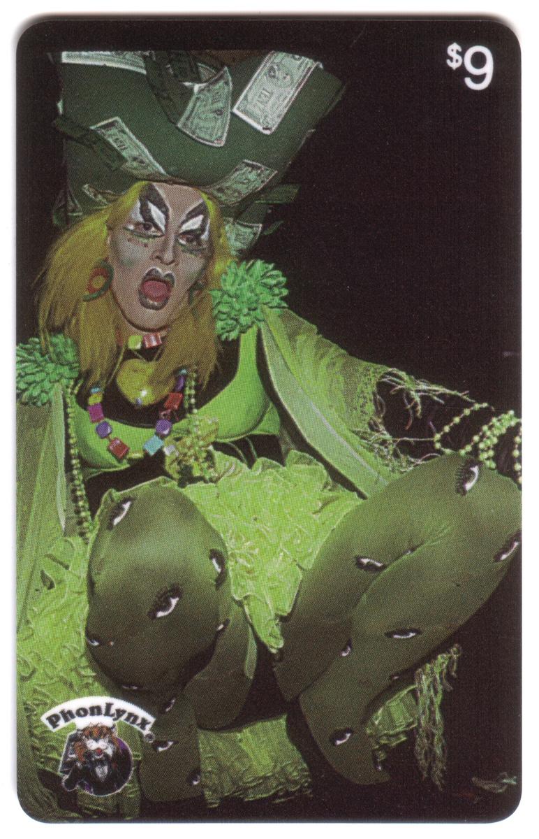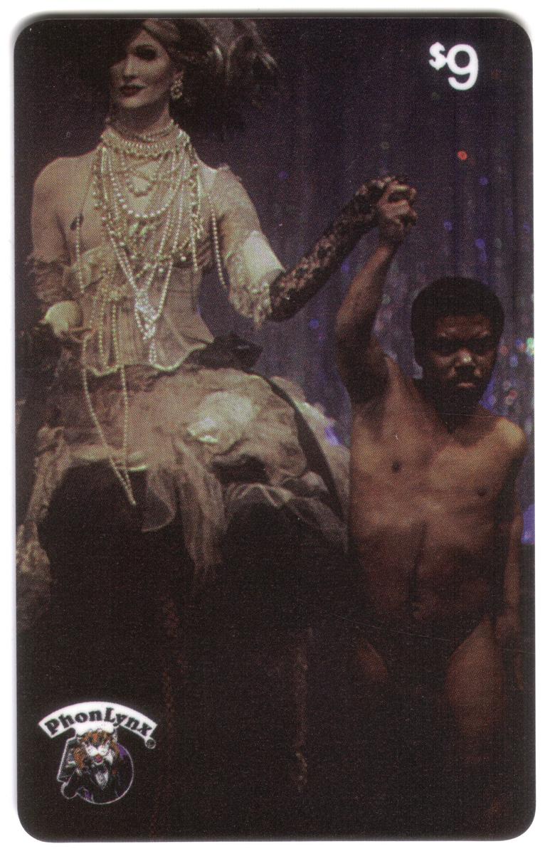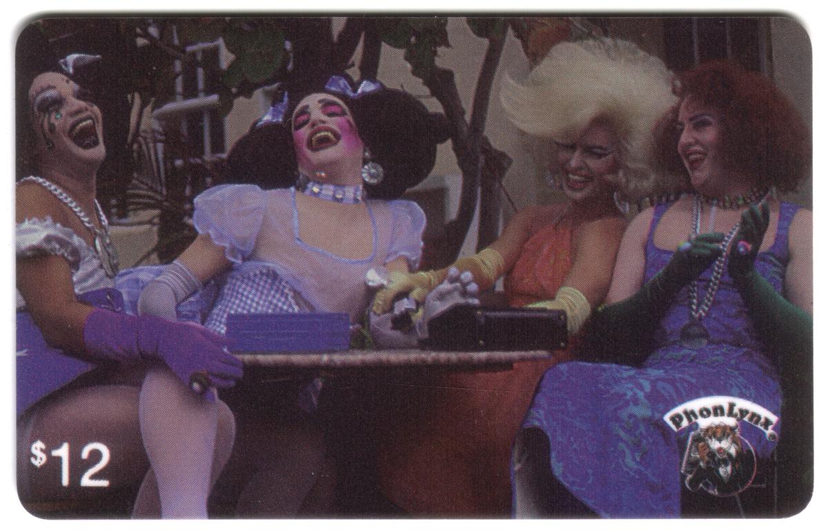 This set of collectible phone cards features a series titled "Drag Queen Series 'A Real Drag'" with photographs by Adolfo Gallela. The cards portray men in drag, depicting drag queens, transgender, and female impersonators in various elaborate costumes and makeup. The images show a range of expressive and dramatic styles, from glamorous and elegant gown looks to bold, theatrical costumes. Each card has a PhonLynx logo featuring a black panther, and monetary values ranging from $9 to $12 are visible on the cards.
