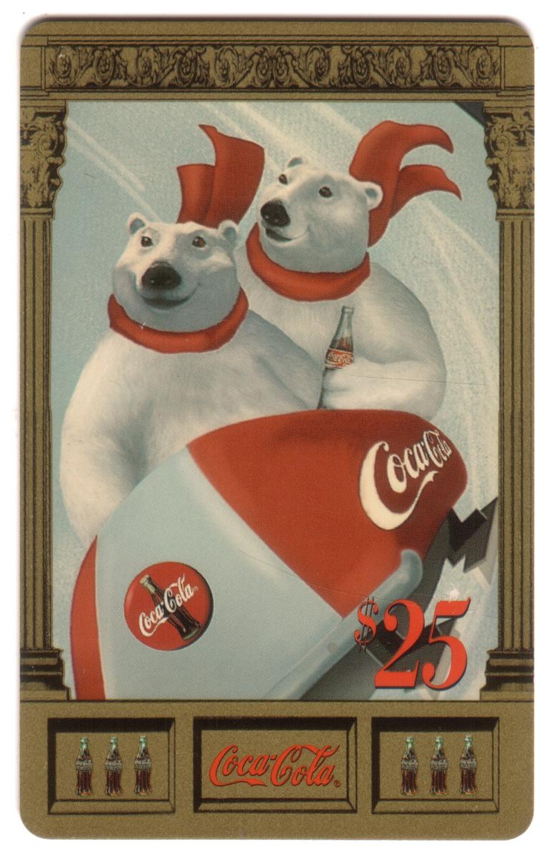 Overall, the card combines Coca-Cola’s classic branding with a festive winter theme featuring the two polar bears in the sled, capturing both holiday spirit and brand recognition within a limited edition series.