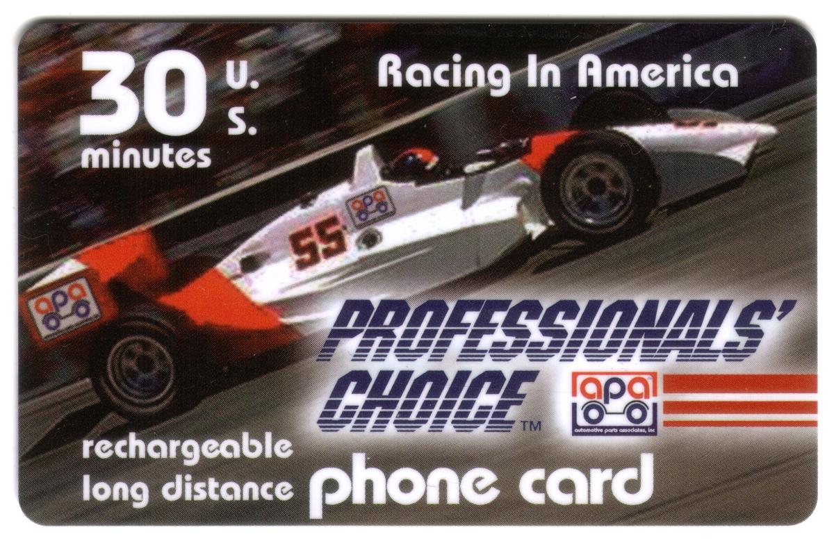 This collectible phone card features a high-quality photographic image of an open-wheel sprint car actively racing on a dirt track. The sprint car is painted mainly in yellow with various sponsor logos visible. The driver is seated in the cockpit wearing a blue racing helmet with a clear visor. The car’s large rear wing prominently displays the text "Automotive Parts Associates 30m Professionals' Choice Auto Racing in America (Sprint)" in red and black lettering on a white background.