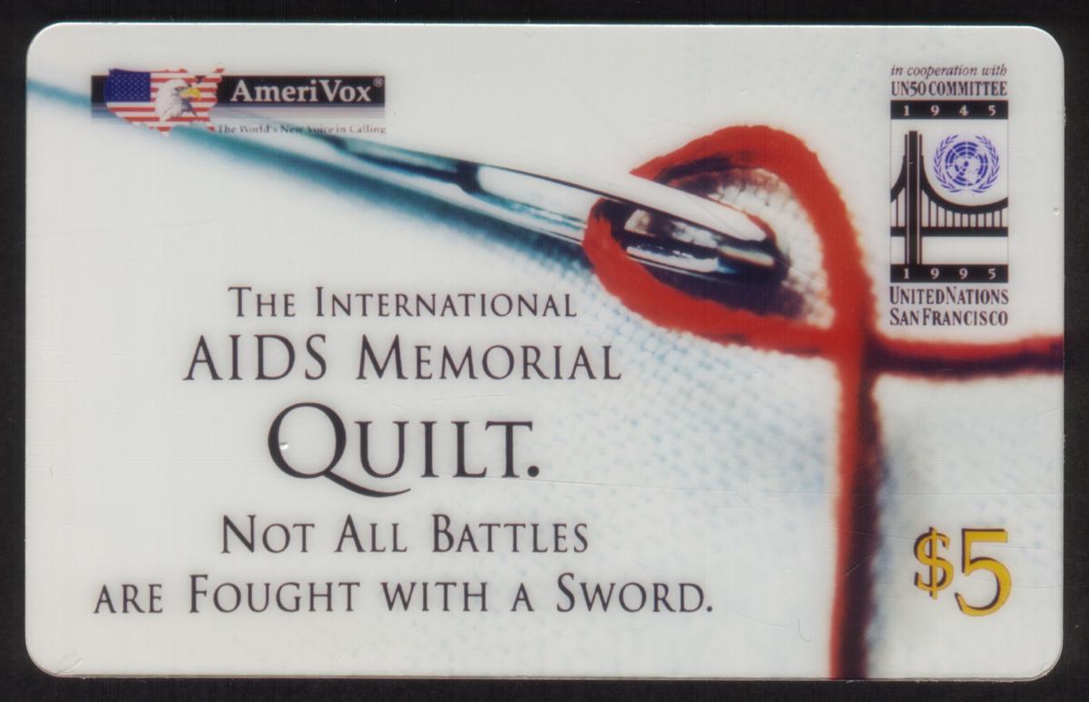 This collectible phone card features a tribute to The International AIDS Memorial Quilt with the text prominently displayed in the center. Below the title is the phrase "Not all battles are fought with a sword," emphasizing the symbolic and emotional significance of the quilt.