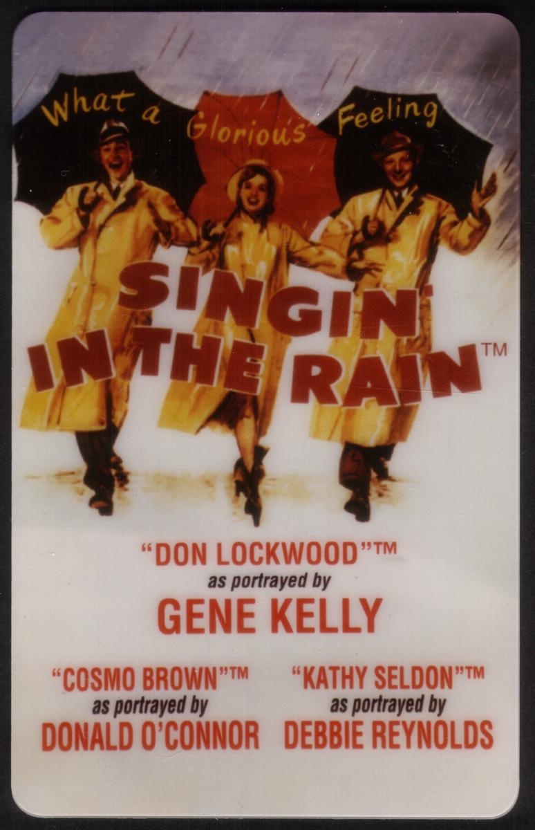 This item is part of a collectible series celebrating movies and film classics, specifically highlighting *Singin' in the Rain* in association with the entertainment industry. The imagery and names on the card firmly connect it to the celebrated musical featuring Gene Kelly and Debbie Reynolds, key figures in movie history.