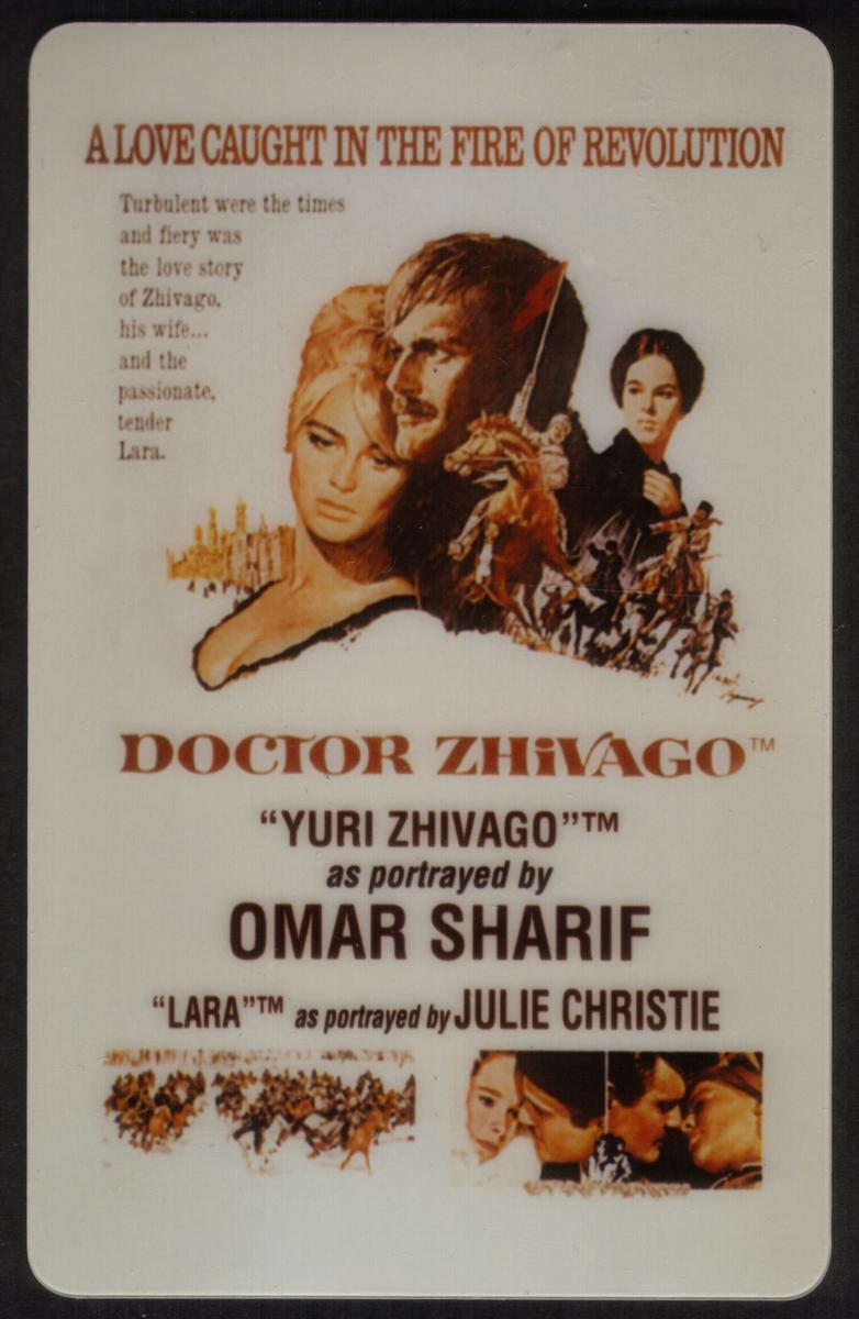 The card also displays a brief description of the story: "Turbulent were the times and fiery was the love story of Zhivago, his wife... and the passionate, tender Lara." The bottom section of the card prominently features the title "Doctor Zhivago" in bold, uppercase letters, with the subtitle "Yuri Zhivago" below it. The names "Omar Sharif" and "Julie Christie" are presented along with references to their roles.