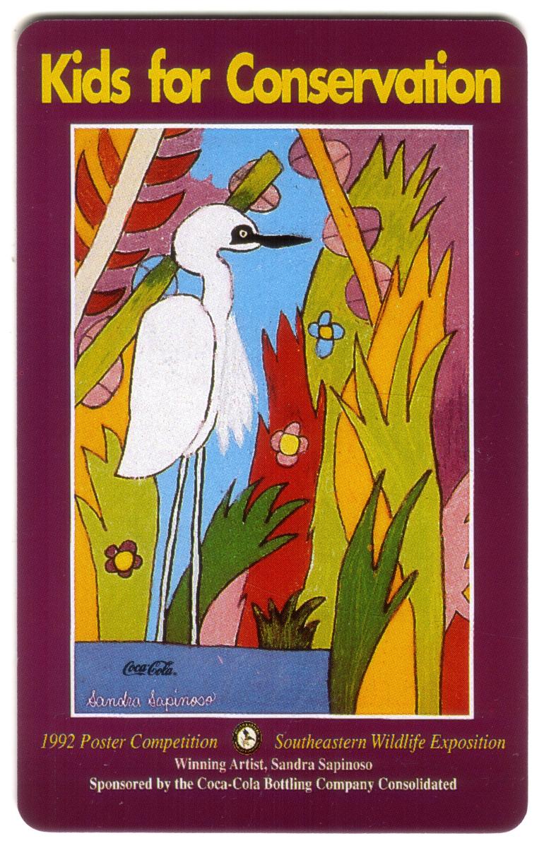 Vibrant 1990s collectible featuring a white stork among colorful plants, promoting conservation and youth involvement, with Coca-Cola branding and artistic highlights. |