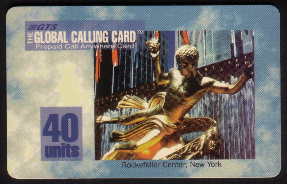 1993 GTS Global Calling Card featuring Rockefeller Center''s Prometheus statue, festive winter design, 40-unit prepaid capacity, and iconic New York City holiday imagery |