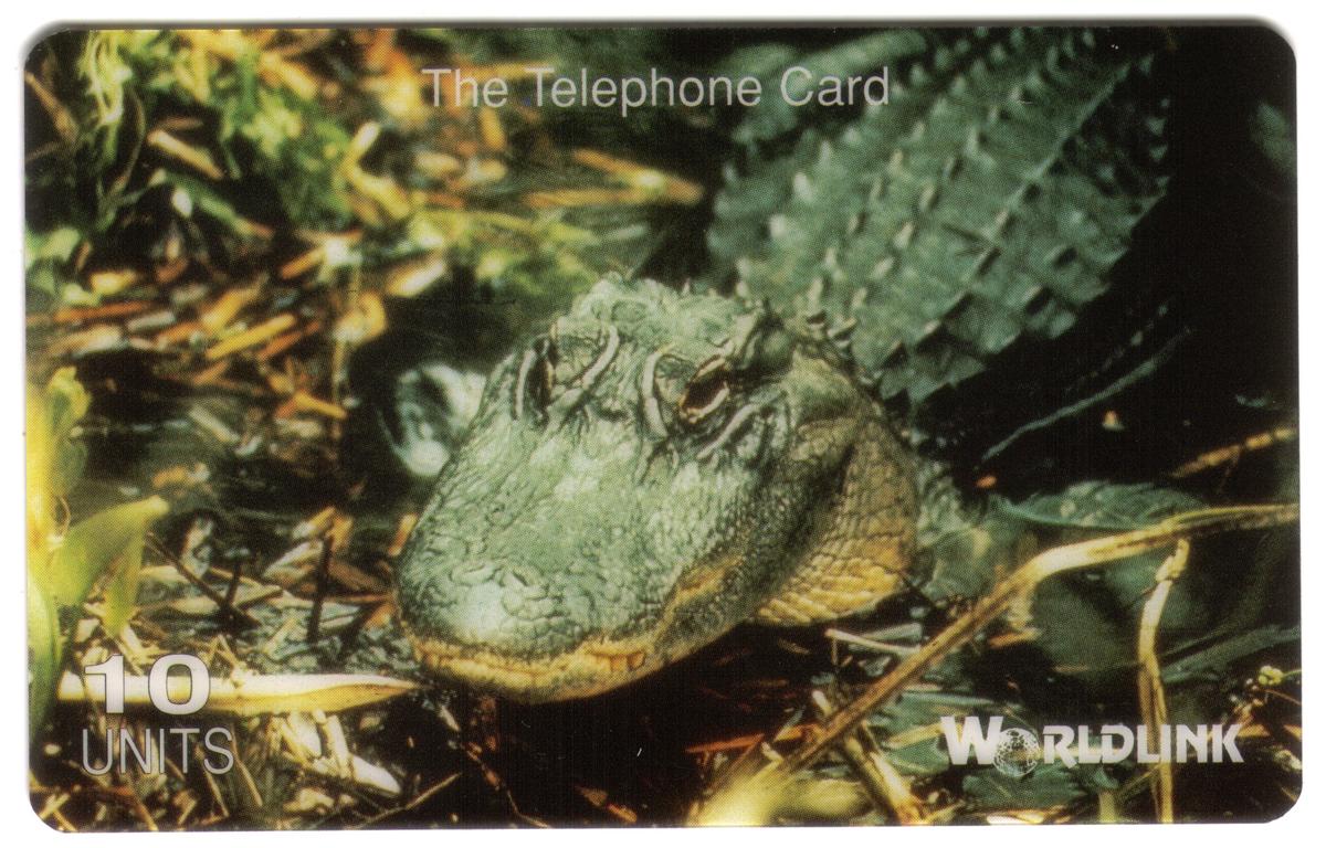 This collectible phone card from WorldLink Communications features a close-up image of an alligator in a swamp environment. The photograph showcases the alligator partially submerged in water, highlighting its textured rough skin, visible eyes, and snout above the waterline. Surrounding the alligator are natural swamp elements such as water, aquatic plants, and reflections, emphasizing the wild and tropical habitat.