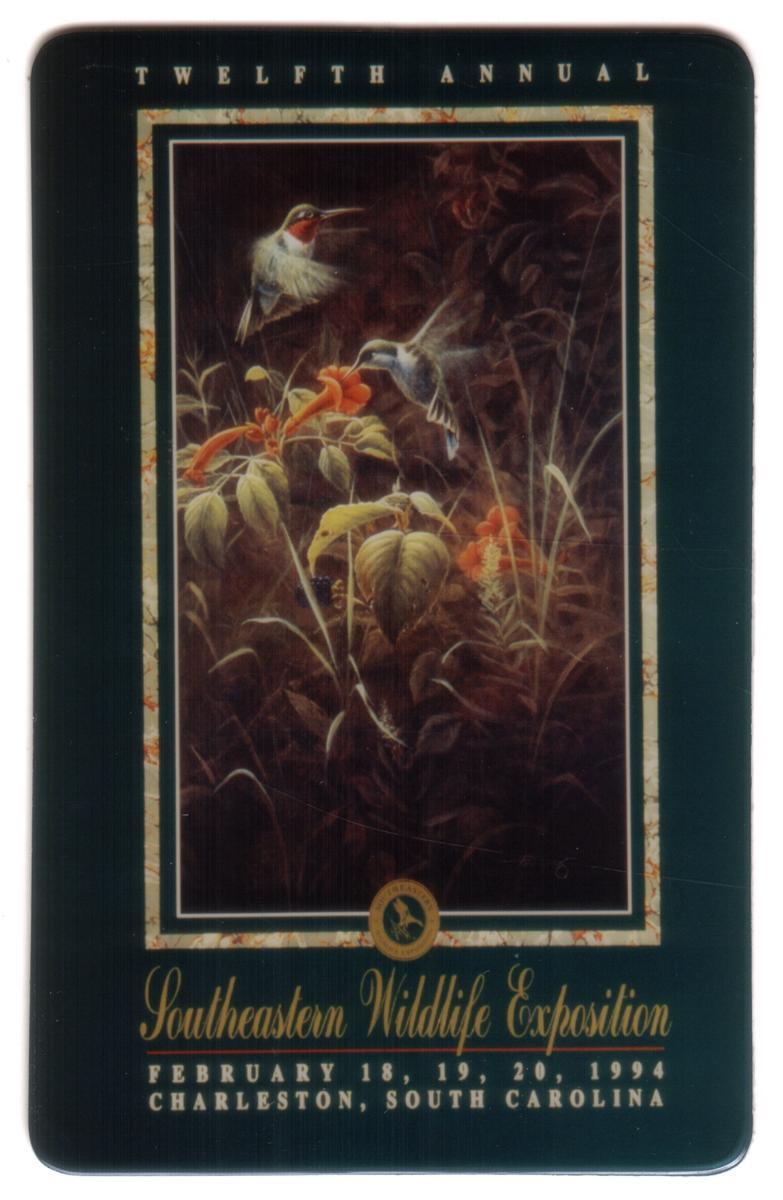 Prominently displayed on the card are the words "Hummingbirds: Southeastern Wildlife Exposition Commemorative," marking it as a special edition issued for the twelfth annual exposition held in Charleston, South Carolina. The card commemorates this 1994 event and features artwork by Paco Young, a recognized artist known for paintings of animals, scenic nature, and wildlife. The term "Flower Dancers" is also included, which relates to the artist’s thematic focus on hummingbirds and their environment.