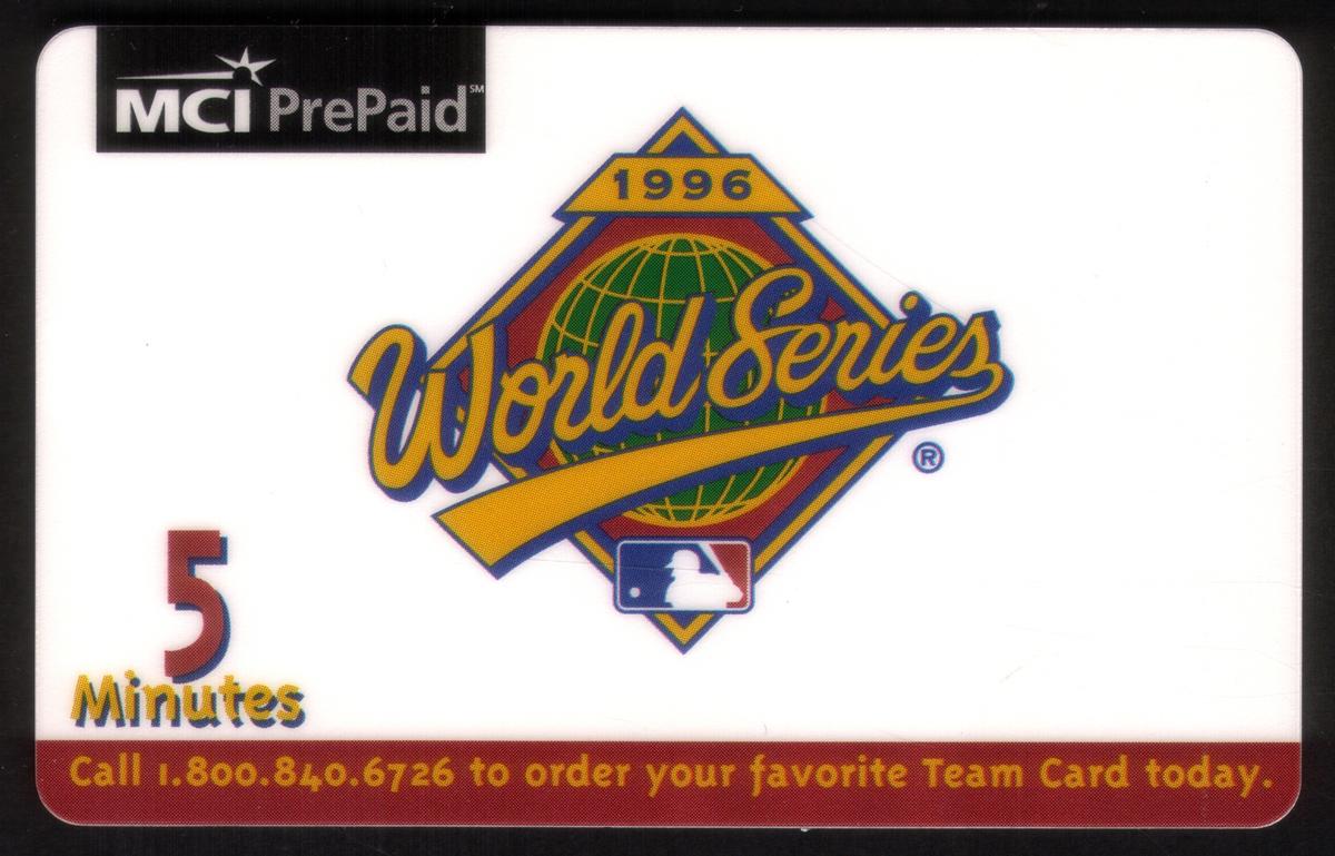 The card is associated with MCI Communications, indicated by text on the front, reflecting a sponsorship or promotional partnership. The card’s denomination is "5m," establishing its value or usage. The overall design and logos relate directly to baseball, specifically highlighting the 1996 Major League Baseball World Series event.