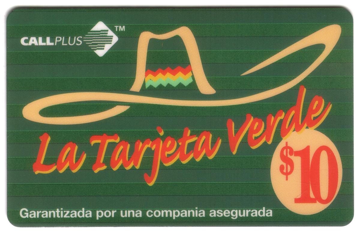 Below the sombrero, the card displays the text "La Tarjeta Verde" in bold, cursive red and yellow letters. To the right of the text is a beige circle with the bold red number "$10," indicating its value. The lower portion of the card includes the phrase "Garantizada por una compania asegurada" in white letters, affirming its guarantee by an insured company.