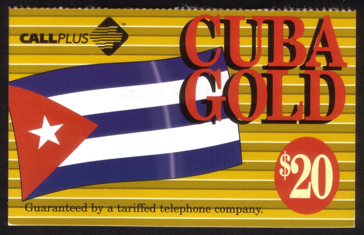 This collectible chip card is an expired, inactive user card from Cuba with a face value of $20. The design prominently features the Cuban flag rendered in gold and colors, set against a paper-style background. The words "Cuba Gold" are displayed clearly on the card, emphasizing the theme. The card includes text written in Spanish, indicative of its origin.