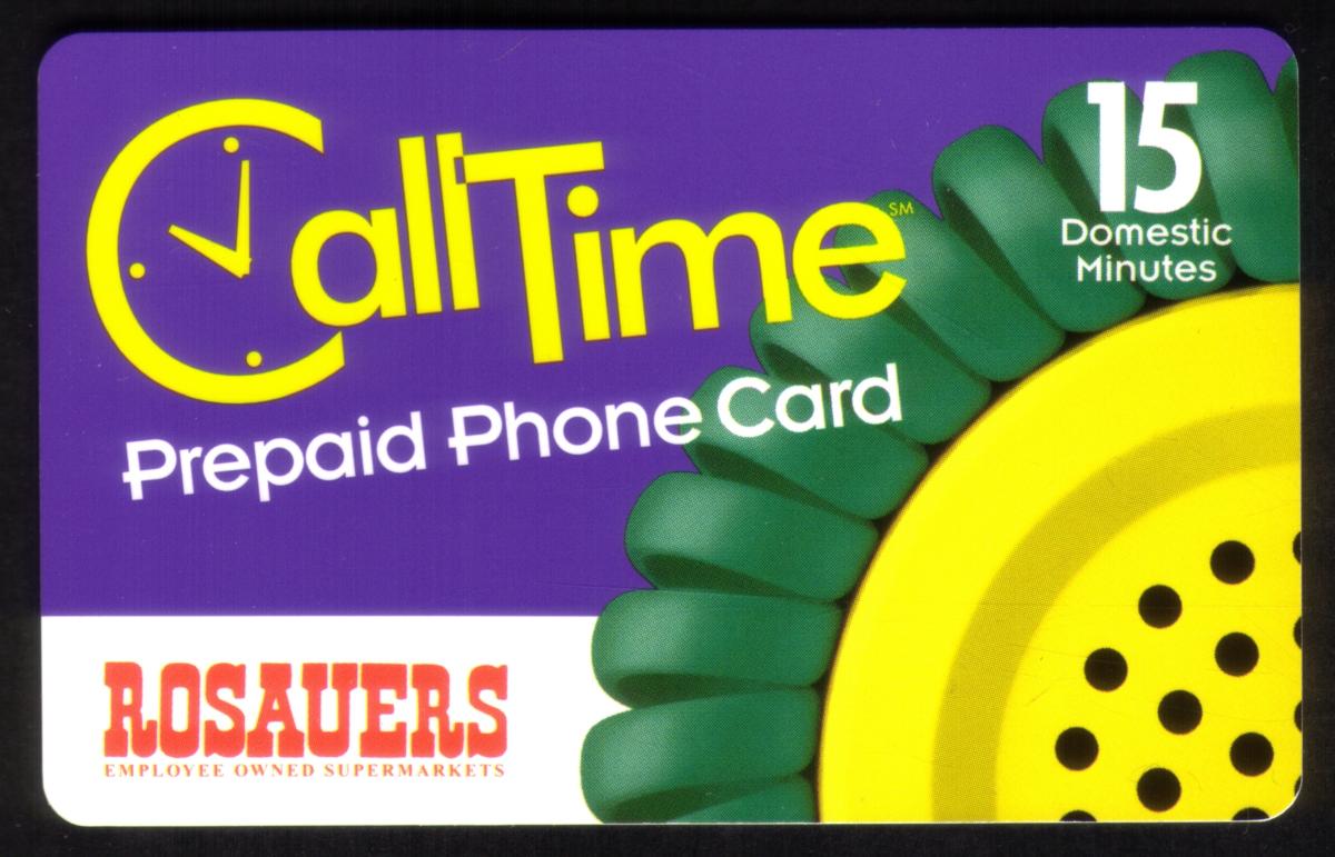 This is a CallTime prepaid phone card offering 15 domestic minutes for telephone use. The card design features a close-up image of a yellow telephone rotary dial set against a dark purple background. The rotary dial is partially visible on the right side, with distinct holes and a green rotary dial mechanism.