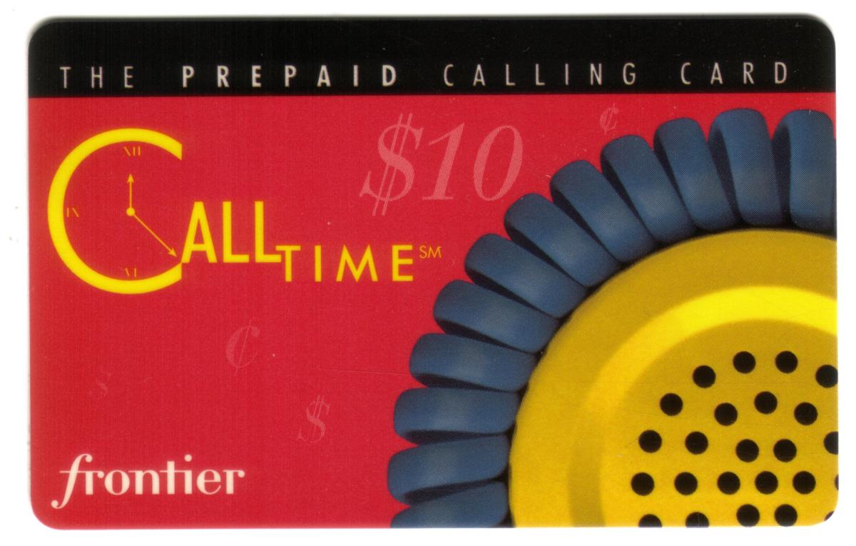 This card is a $10 CallTime prepaid calling card issued by Frontier Communications with a red background, yellow receiver, and blue cord elements. The card is marked as used.