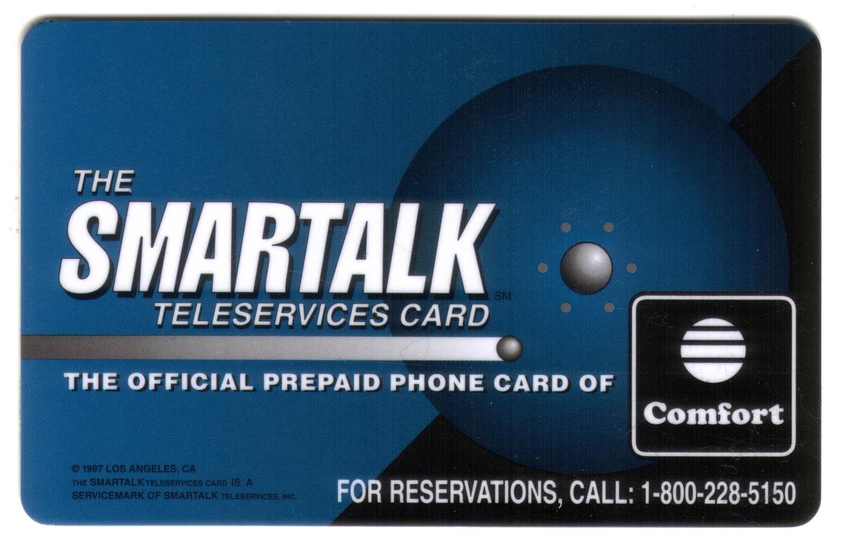 This collectible phone card illustrates the partnership between Comfort Inn and SmarTalk TeleServices, combining hospitality and communication services. It reflects corporate branding on a telecommunications medium commonly used for prepaid calling.