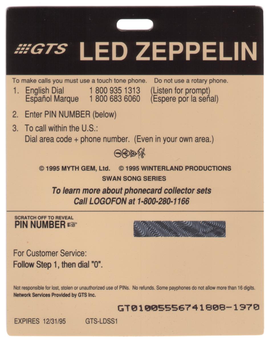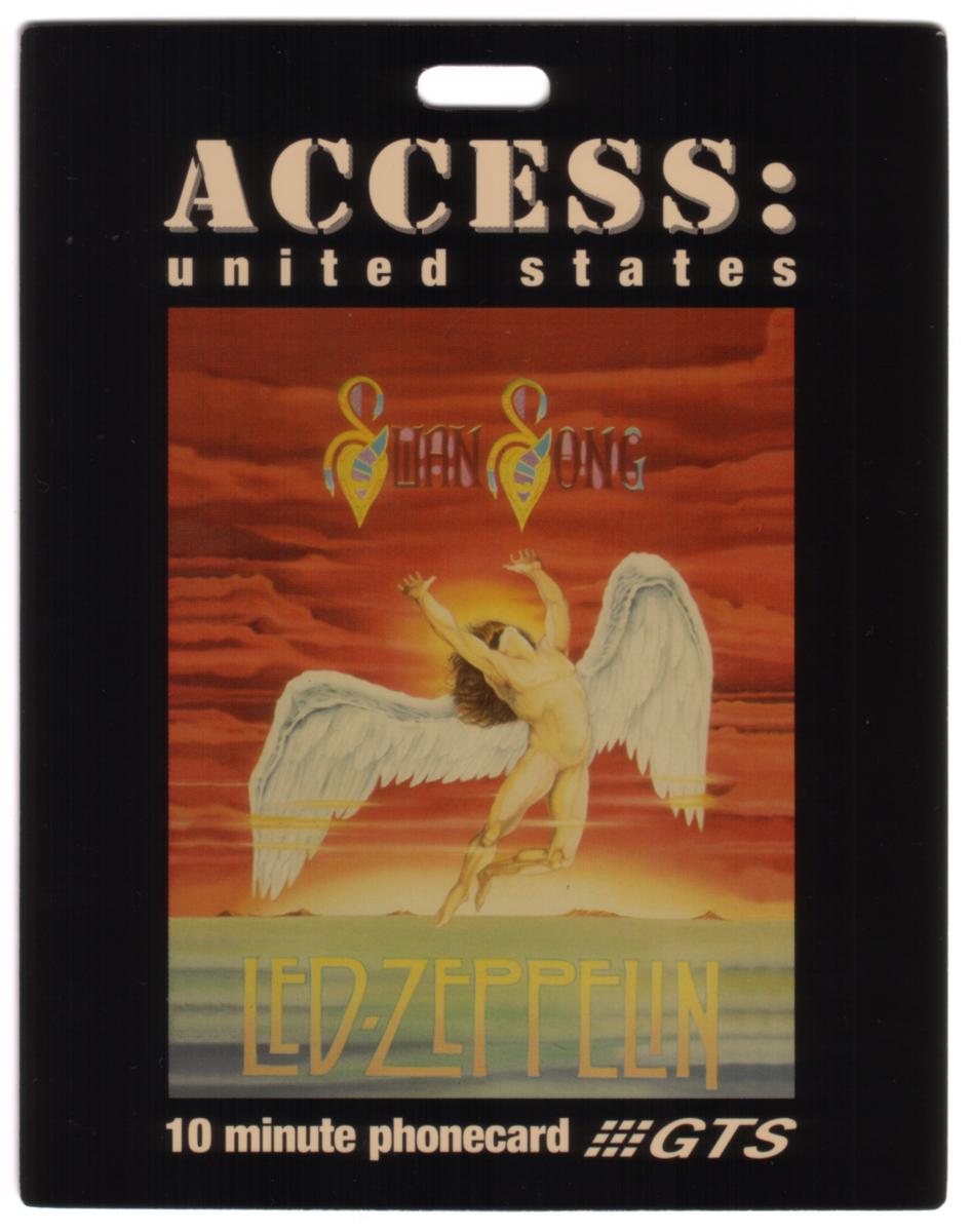 Led Zeppelin themed phone card featuring Icarus artwork from Physical Graffiti, with band symbols, vibrant sunset background, and practical prepaid phone features. |