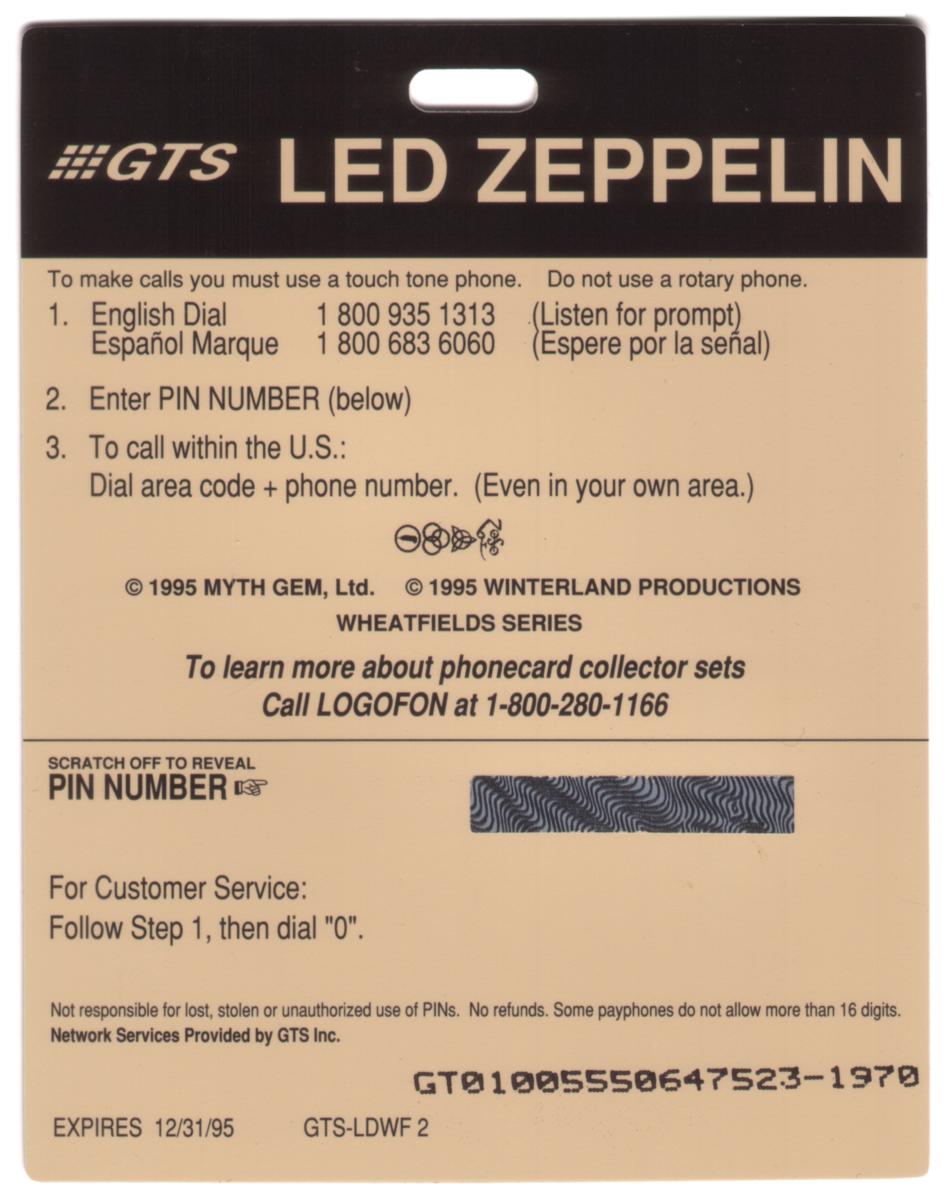 Led Zeppelin 10-minute phone card featuring album cover art, vintage design, distressed font, and practical usage details, blending music memorabilia with utility. |