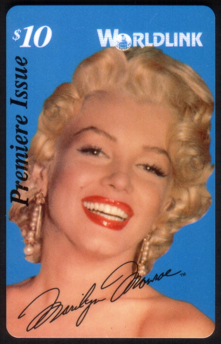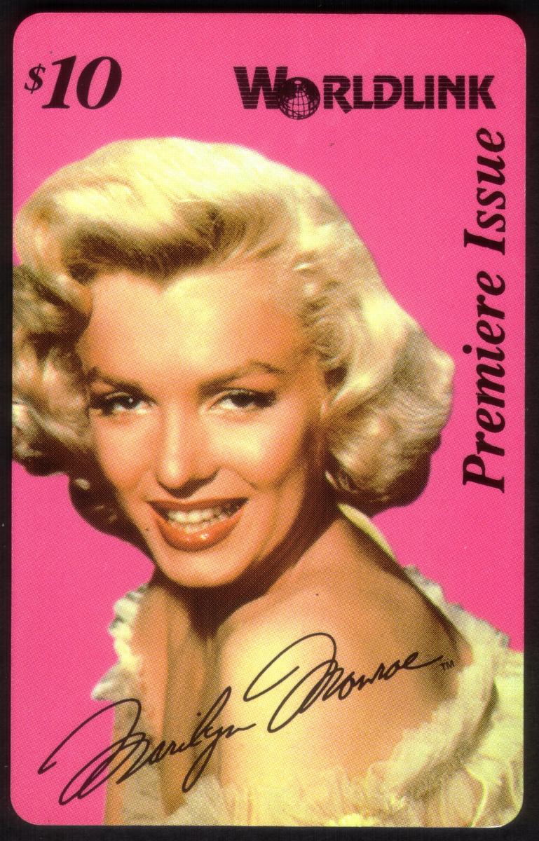 These collectible phone cards each have a $10 value and are issued by WorldLink Communications. They form a set of three cards featuring iconic photographic portraits of Marilyn Monroe, one of Hollywood’s most famous actresses. Each card prominently displays the text "Premiere Issue" vertically along one side, paired with Marilyn Monroe’s scripted autograph near the lower portion of the card. The WorldLink logo with a globe graphic replaces the letter "O" in the name and appears near the top center or lower center, depending on the card.